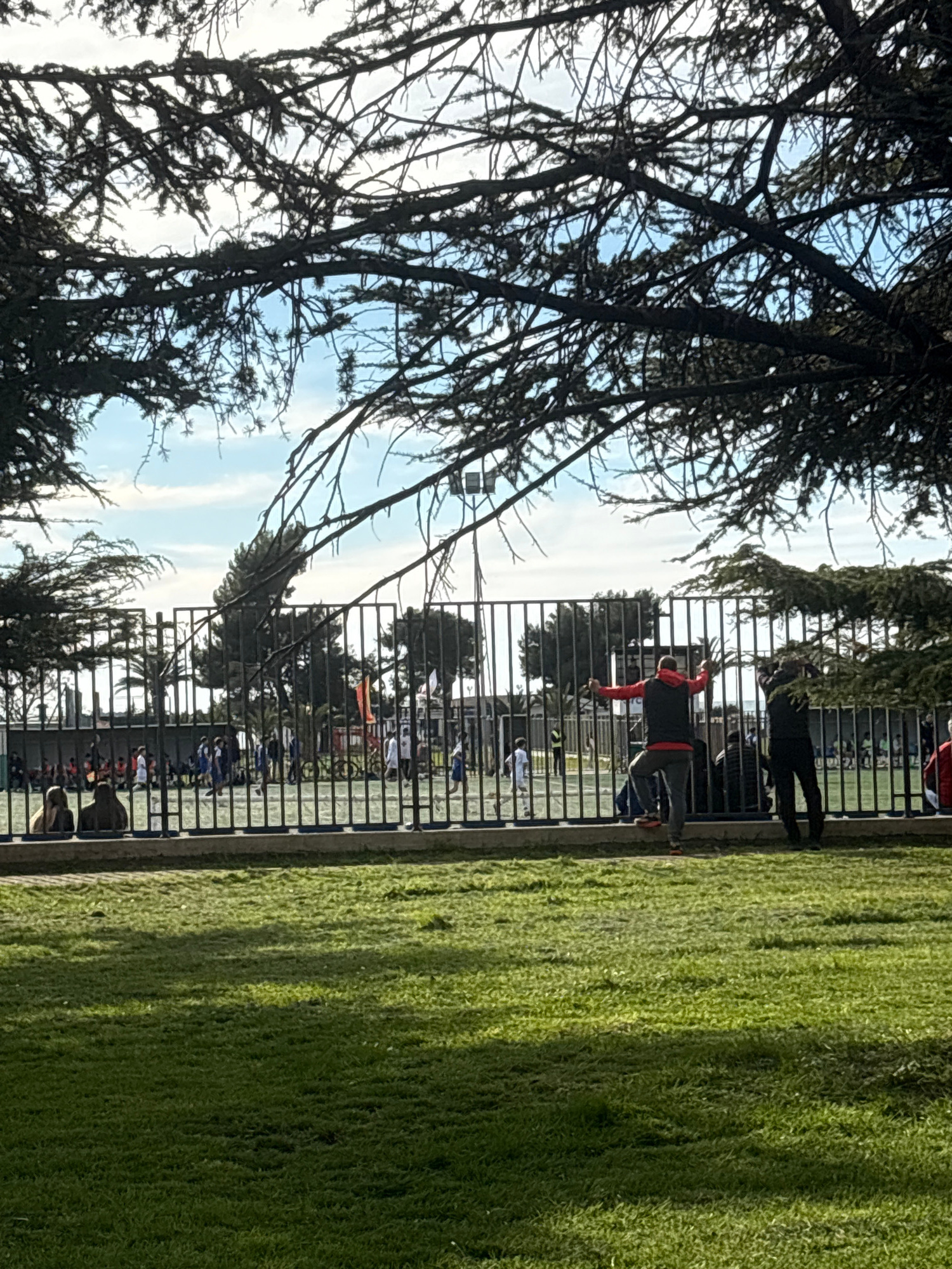 The image captures a scene along a fence bordering a green field, likely a sports or recreational area. The fence is a metal structure with regularly spaced vertical bars. Several people are visible o…read more