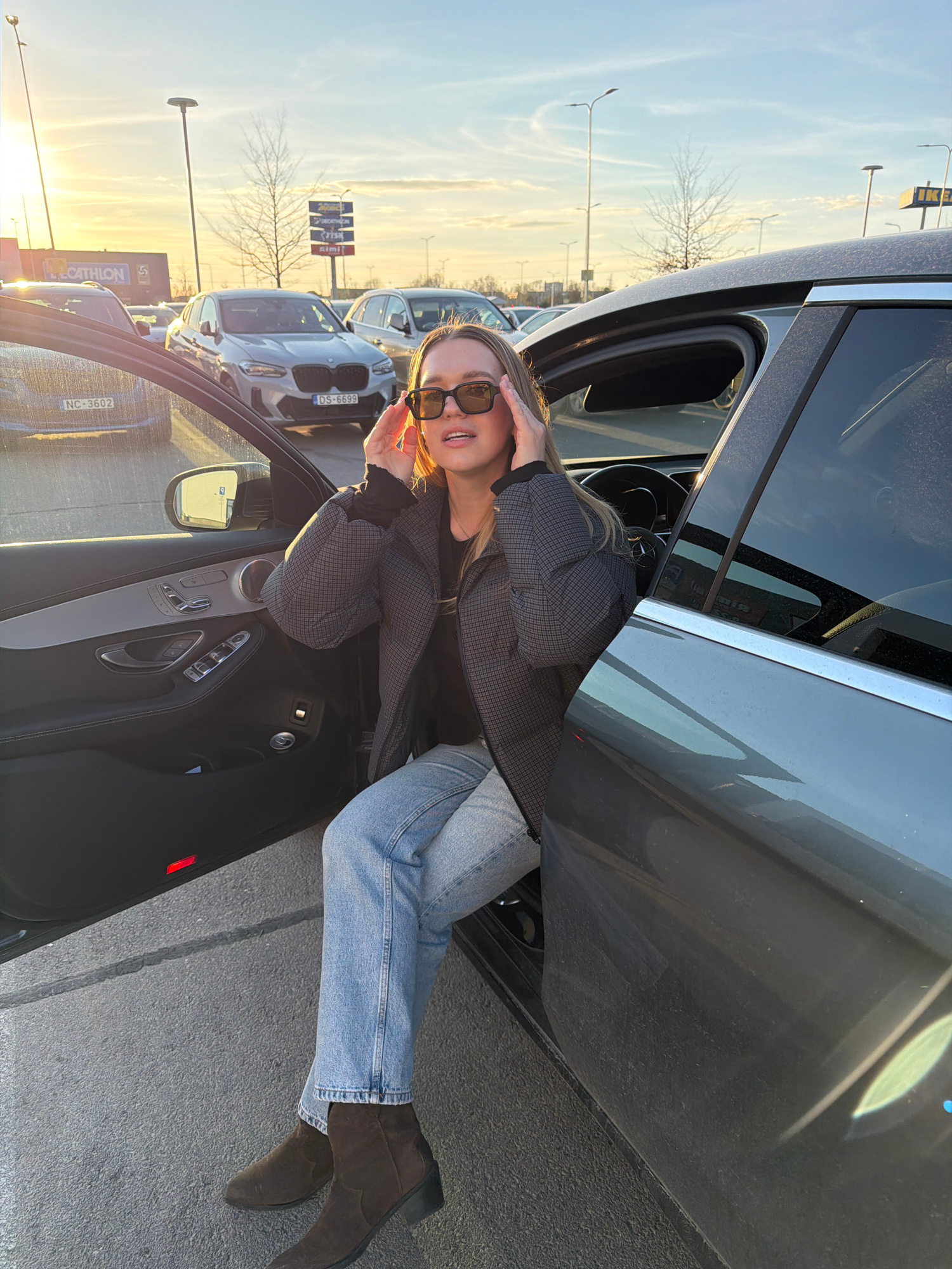 A woman with long blond hair is positioned inside a parked gray car with the driver's side door open. She is wearing sunglasses, a gray plaid jacket, light blue jeans, and brown suede boots. The car i…read more