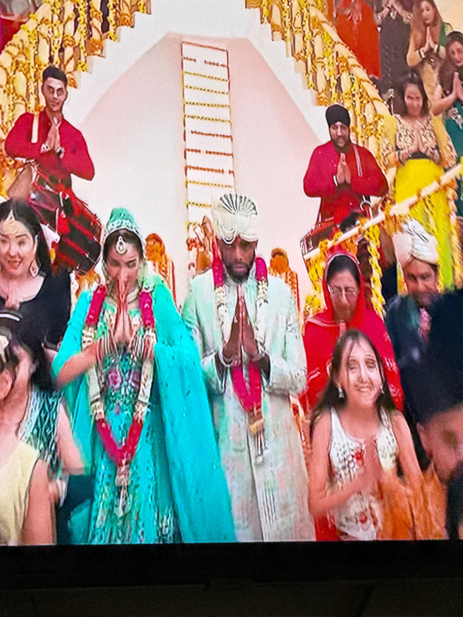 The image depicts a wedding celebration, likely in Morogoro, Tanzania, given the prompt. A bride in a turquoise garment and groom in a light green and white outfit are adorned with red garlands and su…read more