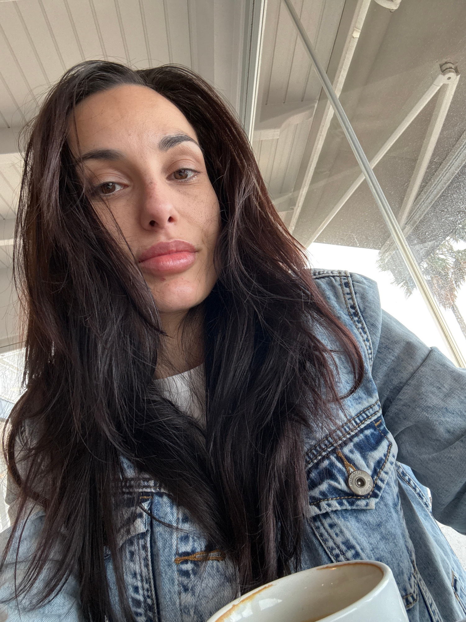 A medium-shot, canted, eye-level image shows a light-skinned person with long, dark hair positioned centrally. The person is wearing a denim jacket and a white t-shirt. The person's face is angled tow…read more