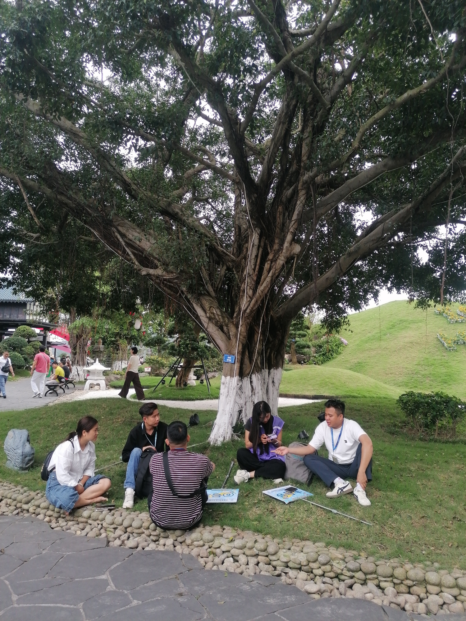 In Hong Gai Ward, Vietnam, a group of five individuals is seated on the grass beneath a large tree. One man, wearing a white t-shirt, appears to be talking or lecturing, gesturing with his right hand.…read more
