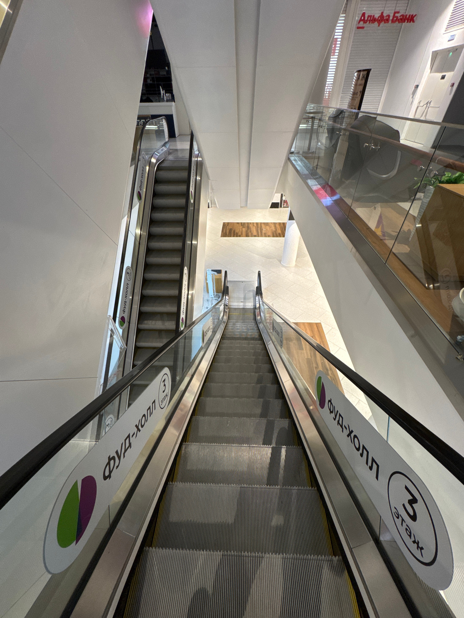 The image shows an escalator inside a modern building, likely a shopping mall or commercial center. The escalators have a signage indicating "Food Hall" on the 3rd floor, with the phrase written in Cy…read more