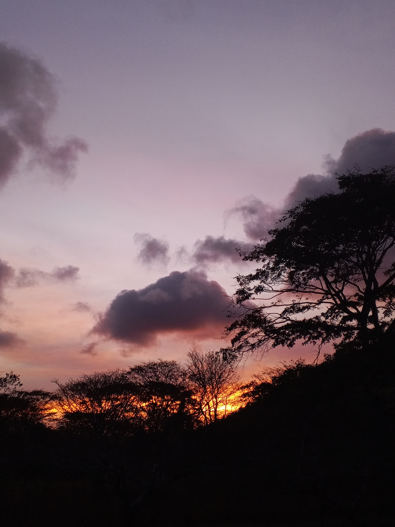 The image depicts a sunset scene in Santa Ana, Venezuela, characterized by silhouettes of trees and foliage against a backdrop of a gradient sky with clouds. The sky transitions from shades of orangeβ¦read more