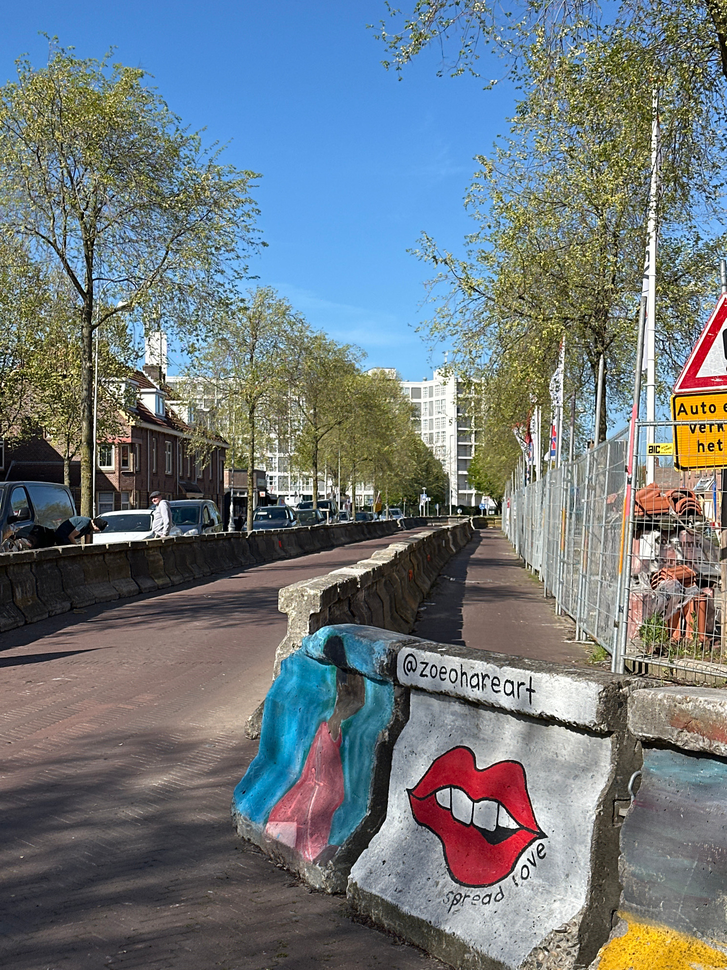 The image displays a sunny urban street scene, captured with a vertical orientation (rotated 90 degrees clockwise). A red-brick pathway, likely for pedestrians or cyclists, extends into the distance,…read more