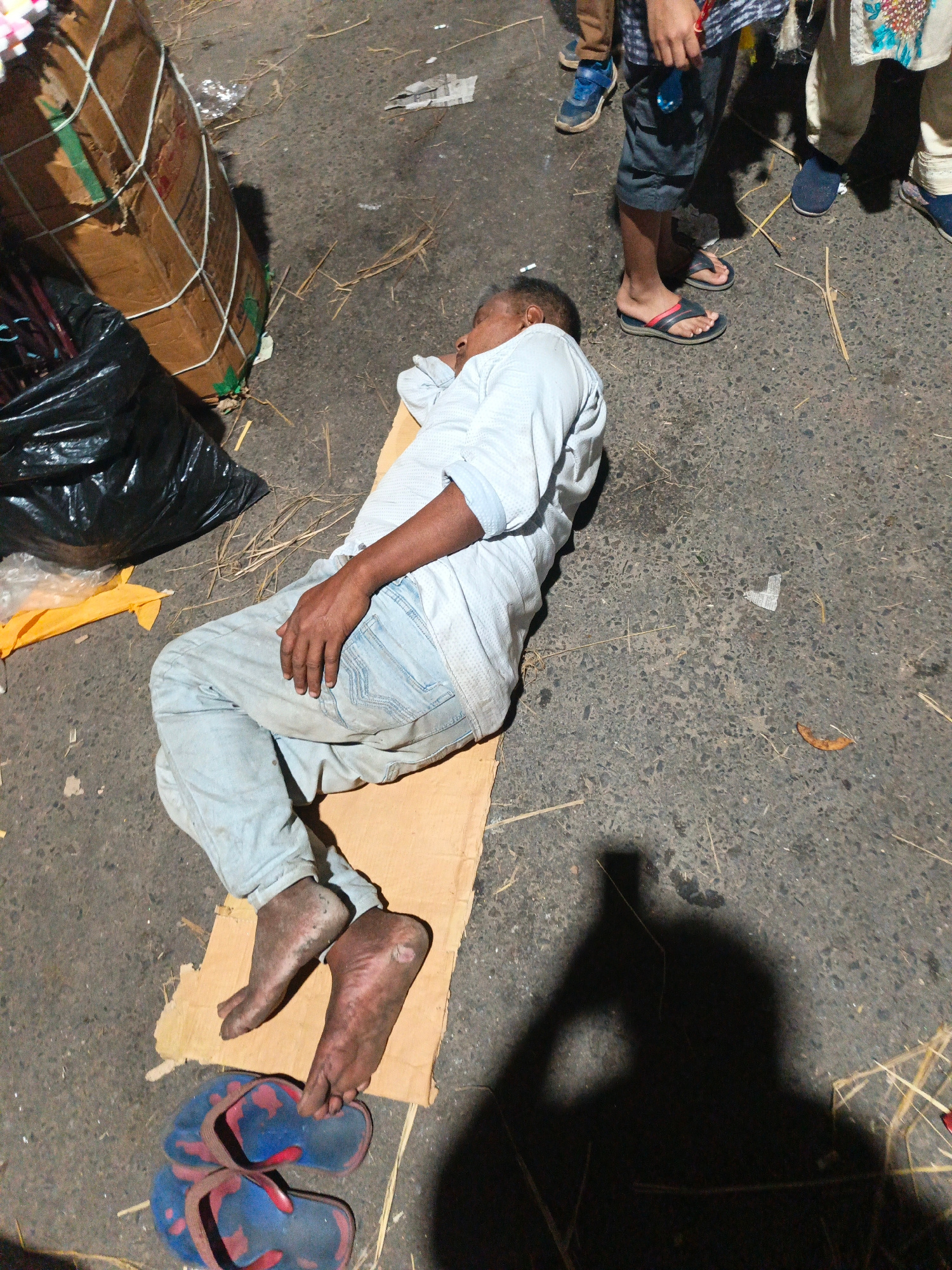 An adult male is lying on his side atop a piece of cardboard on a paved surface, likely a street. He is wearing a light-colored, button-down shirt and light-colored jeans. His feet are bare and appear…read more