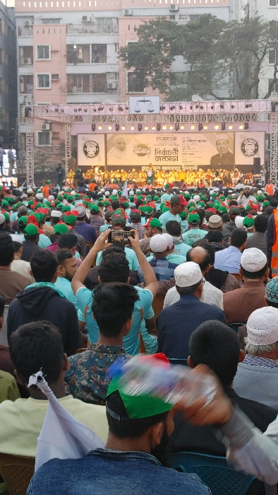 An outdoor political rally is depicted in an urban area of Dhaka, Bangladesh, during daylight hours. A large crowd, primarily composed of adult males, is assembled, facing a substantial temporary stag…read more