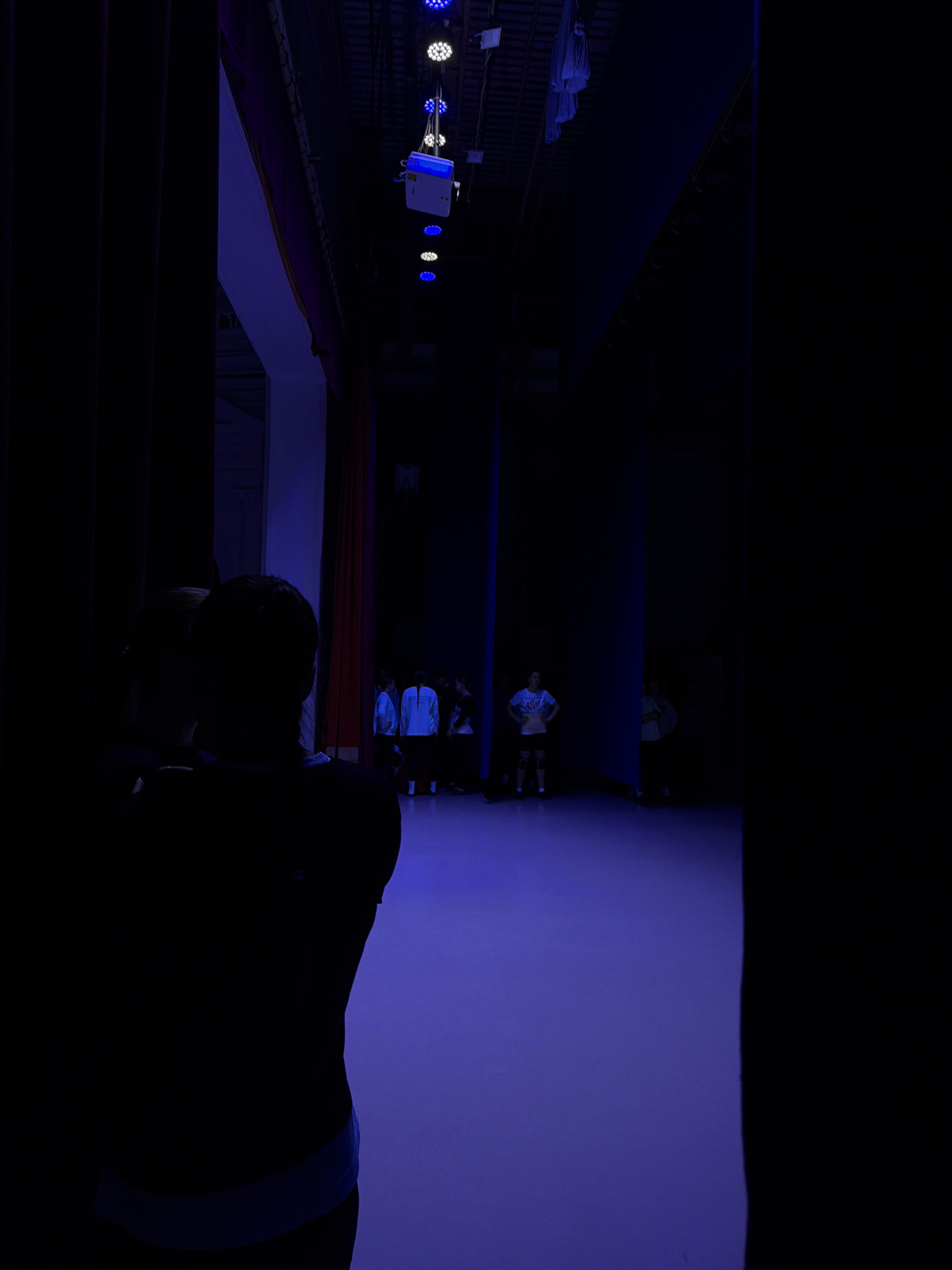 This image, taken in Perm, Russia, depicts an indoor event, likely a performance or presentation, characterized by a dark environment illuminated by artificial light. The perspective is from an elevat…read more