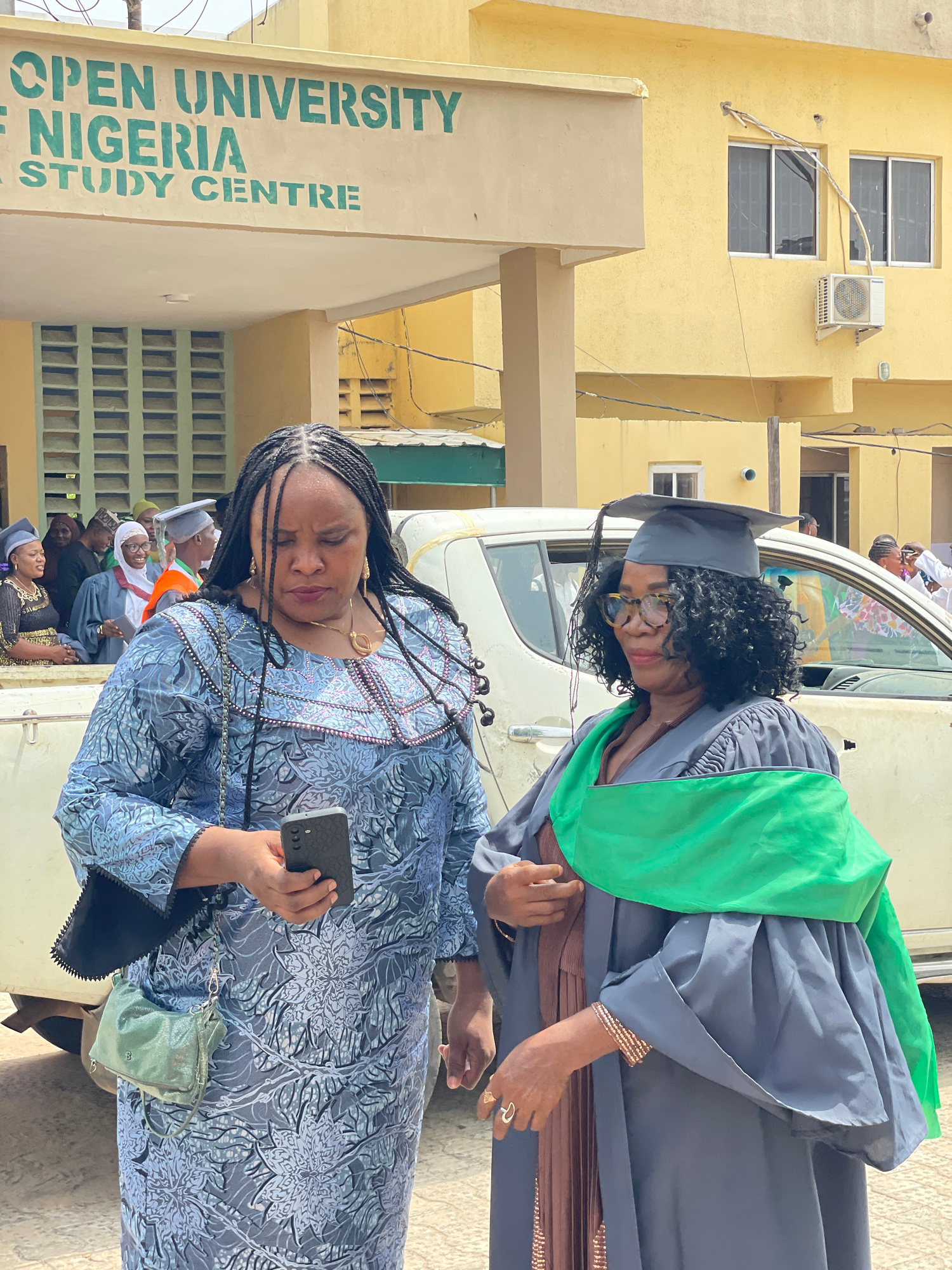 The photo captures two women in what appears to be a celebratory setting. A woman wearing a graduation gown (grey with a green sash) and mortarboard cap stands near another woman who holds a cell phon…read more