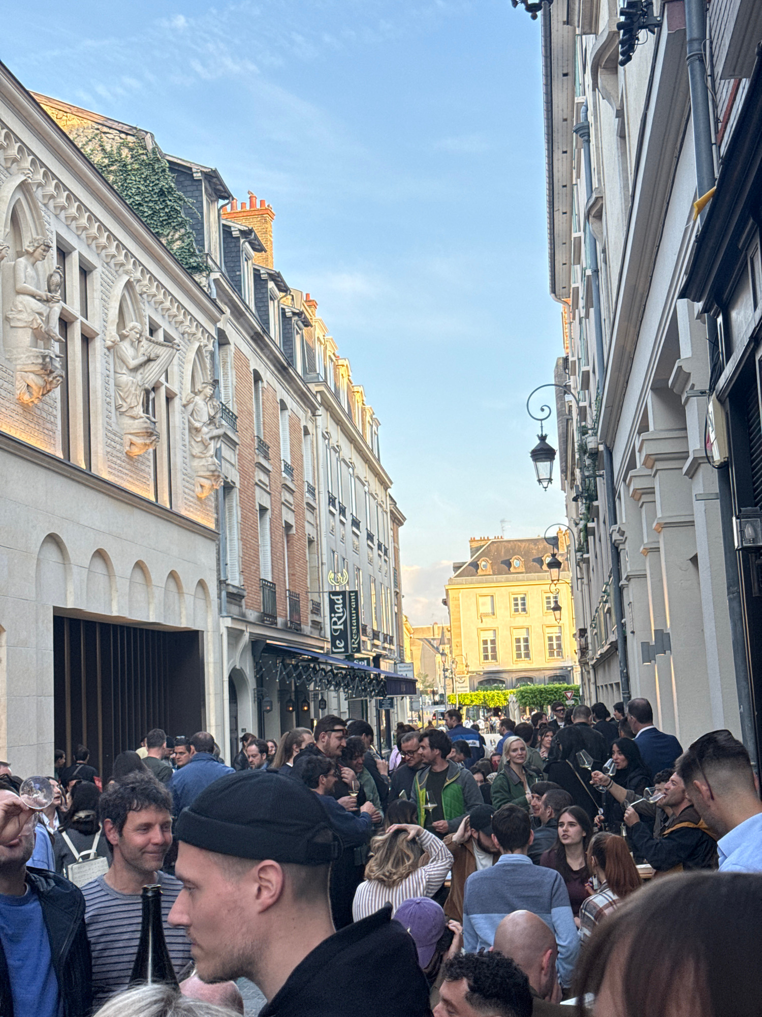 This image depicts a crowded outdoor seating area of a restaurant, with people dining and drinking. The location appears to be in Reims, France, based on the architectural style of the buildings. The…read more