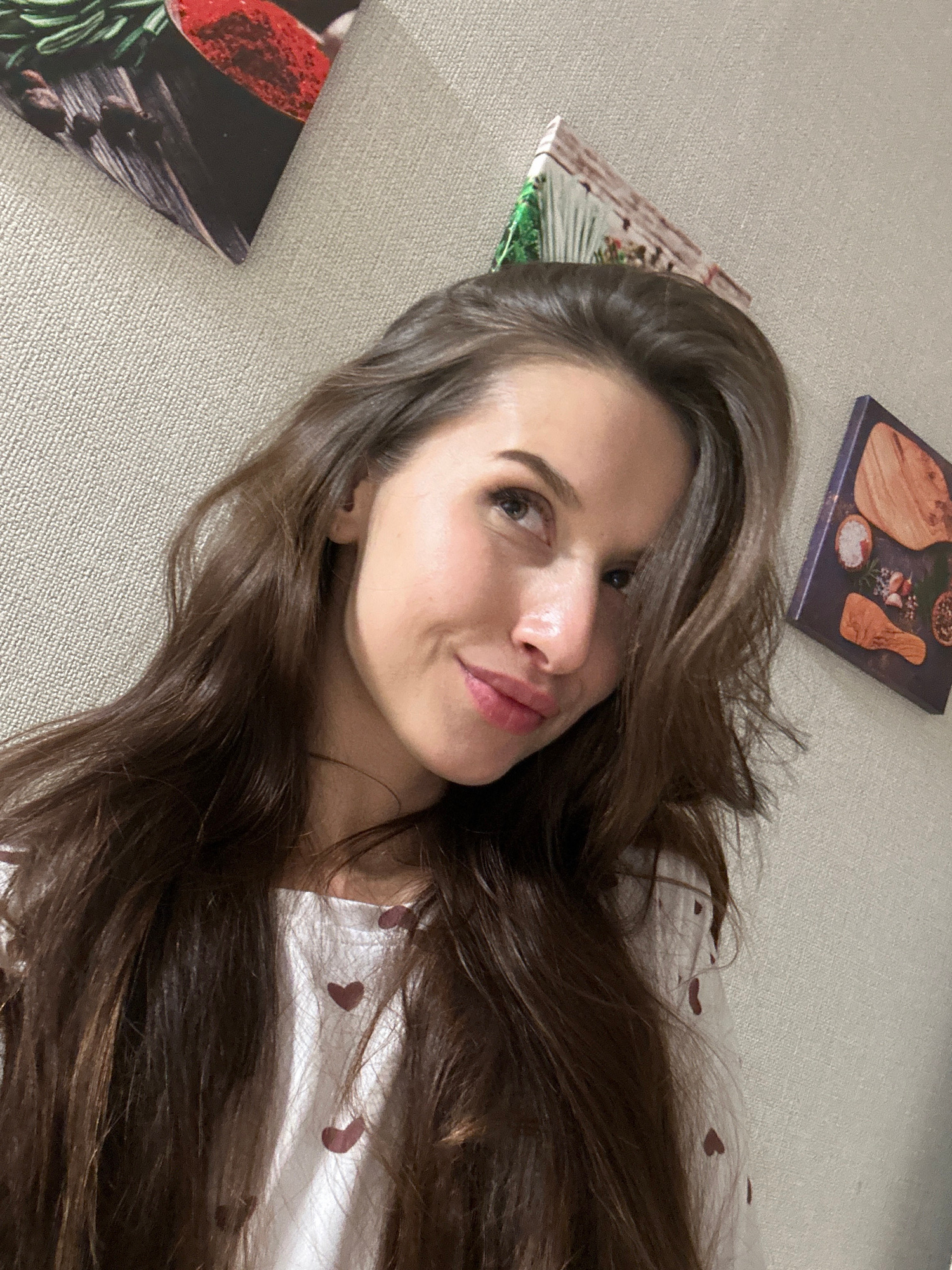 A woman with long brown hair is lying on a light-colored, textured surface, possibly a sofa or bed. She is wearing a white top with small red heart patterns. Three square objects with images on them a…read more