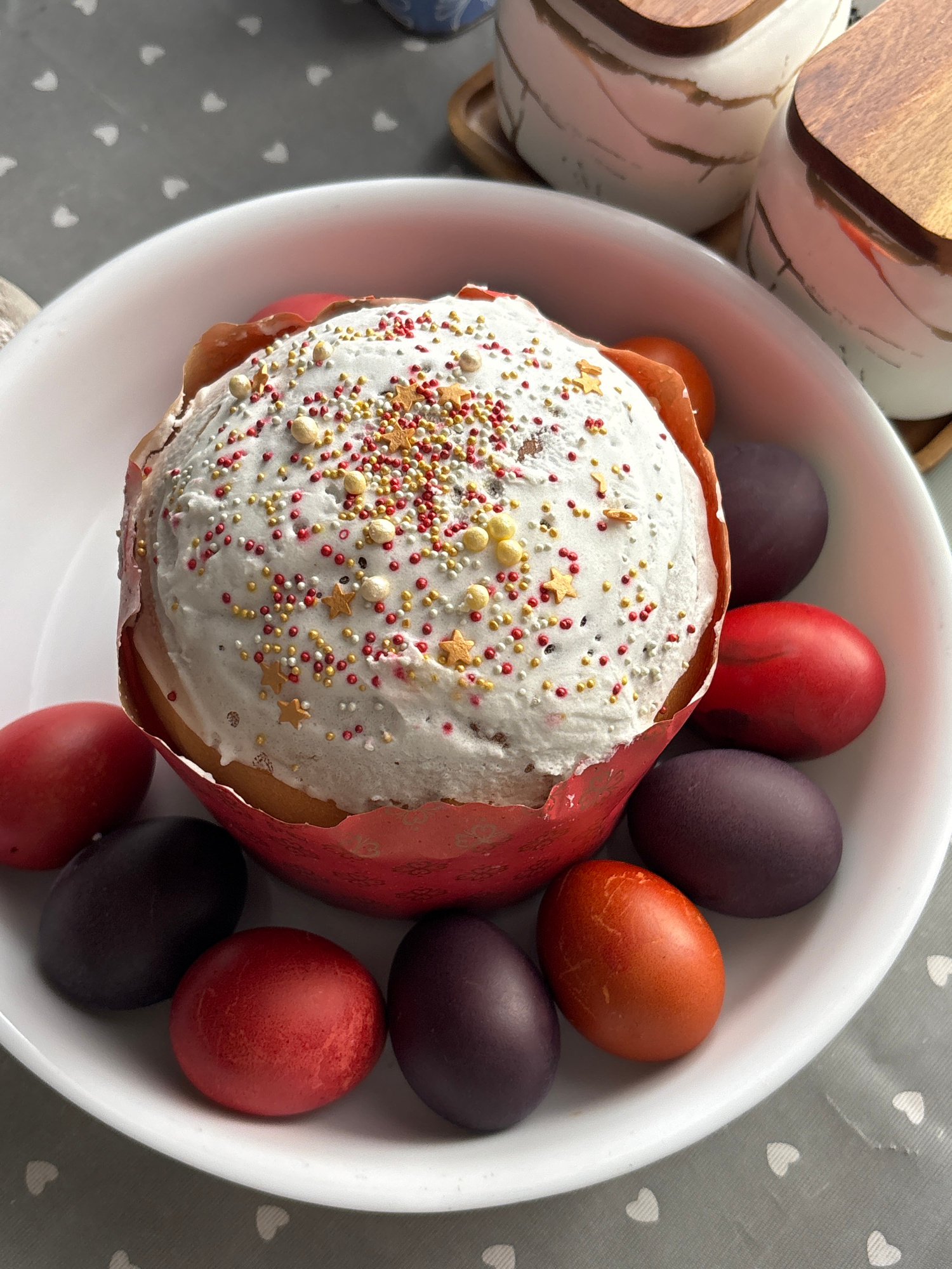 A high-angle shot shows an Easter cake and dyed eggs on a white plate. The cake has a white frosting covered in colorful sprinkles and is sitting in a red paper liner. Around the cake are red, purple,…read more