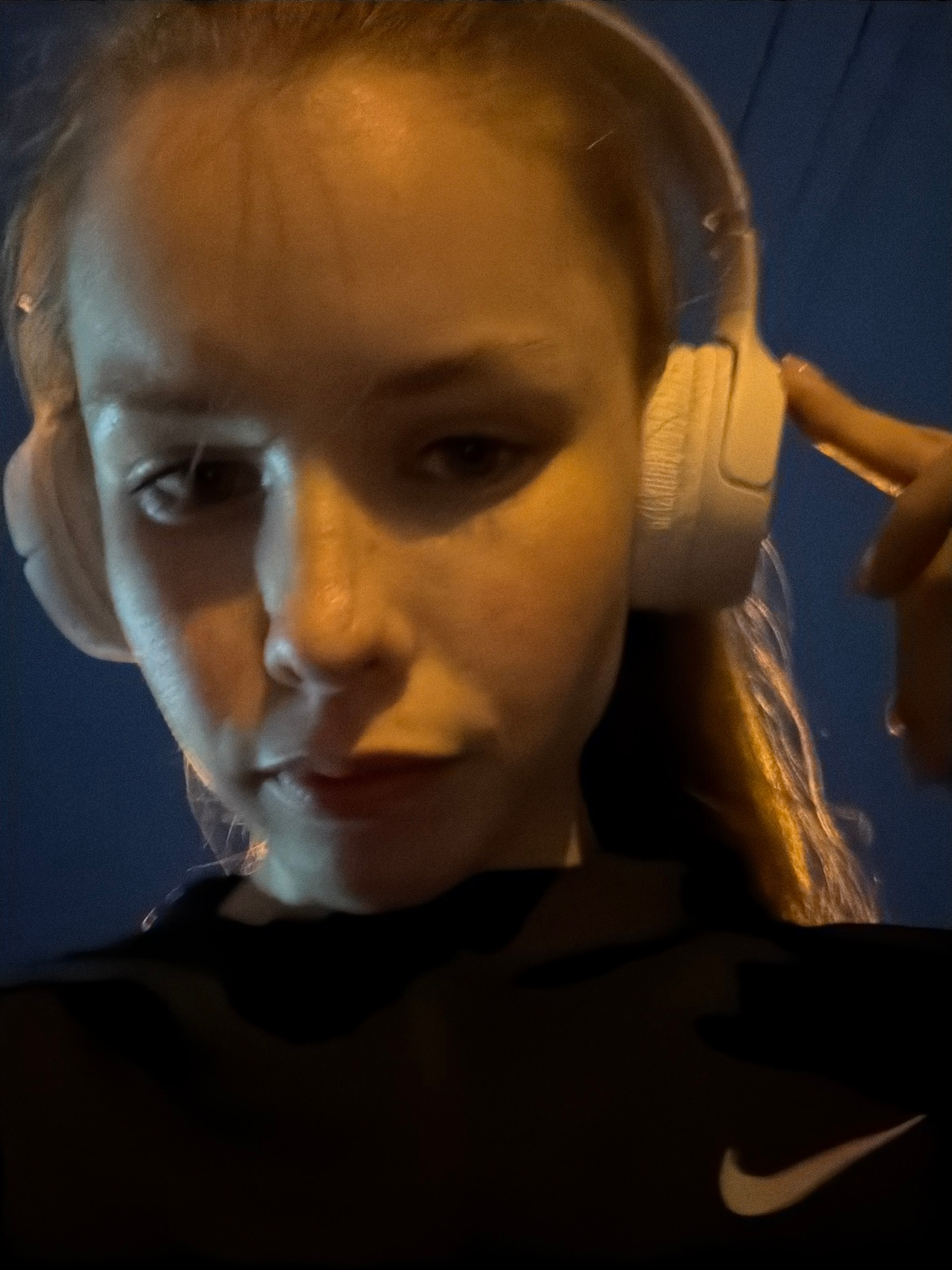 A low-angle selfie of a woman with blonde hair wearing white headphones and a dark Nike sweatshirt. The background is a dark blue, likely at night. There is no information in the image to suggest the…read more