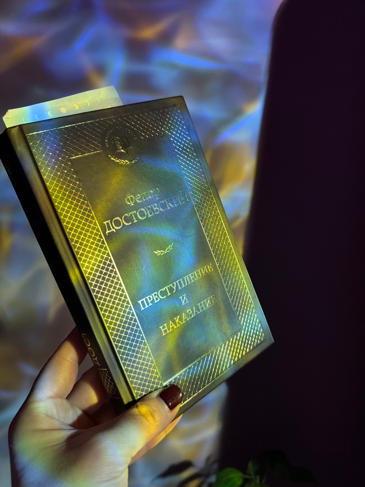 A hand holds a book titled "Crime and Punishment" in Russian (Преступление и наказание). The book is black with a gold-patterned border and gold lettering. A bookmark is partially inserted into the bo…read more