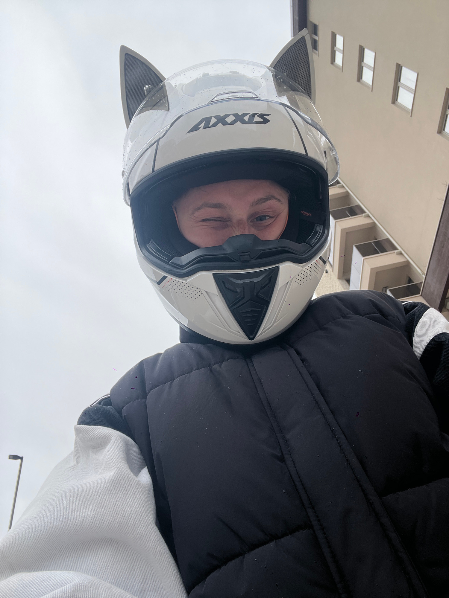 A person wearing a white motorcycle helmet is pictured, facing the camera. The helmet has clear rain drops on the visor and decorative cat ears. The person also wears a puffy black jacket with a white…read more