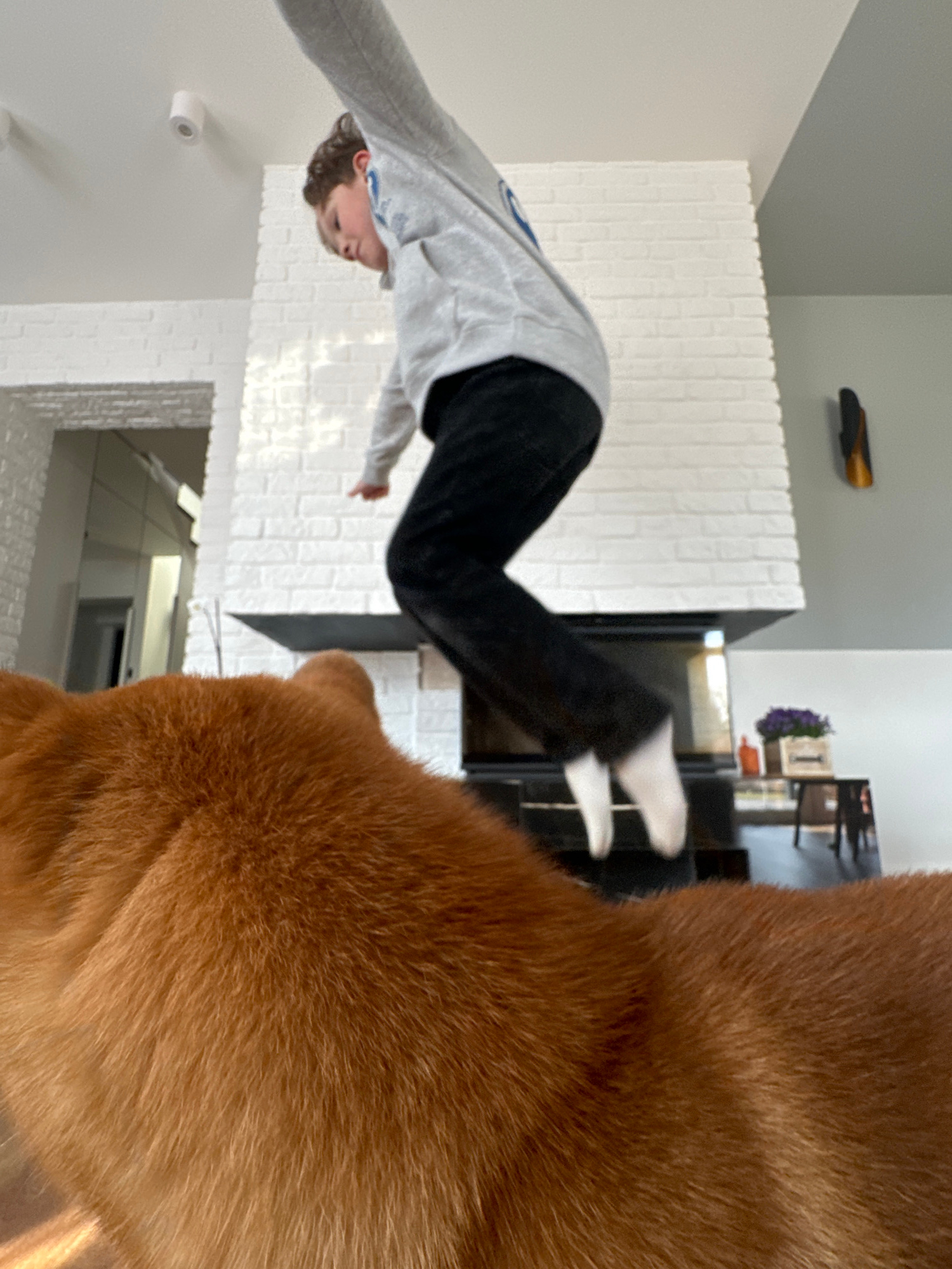A young male is in mid-air, horizontally oriented, wearing a gray sweatshirt and black pants with white socks. He is positioned in front of a white brick fireplace with a black mantle. A portion of a large, ginger-colored dog is in the foreground, obscuring part of the scene. Background elements include interior furniture and decorations. The location of Carnikava, Latvia is not evident in this image. | Open Wire