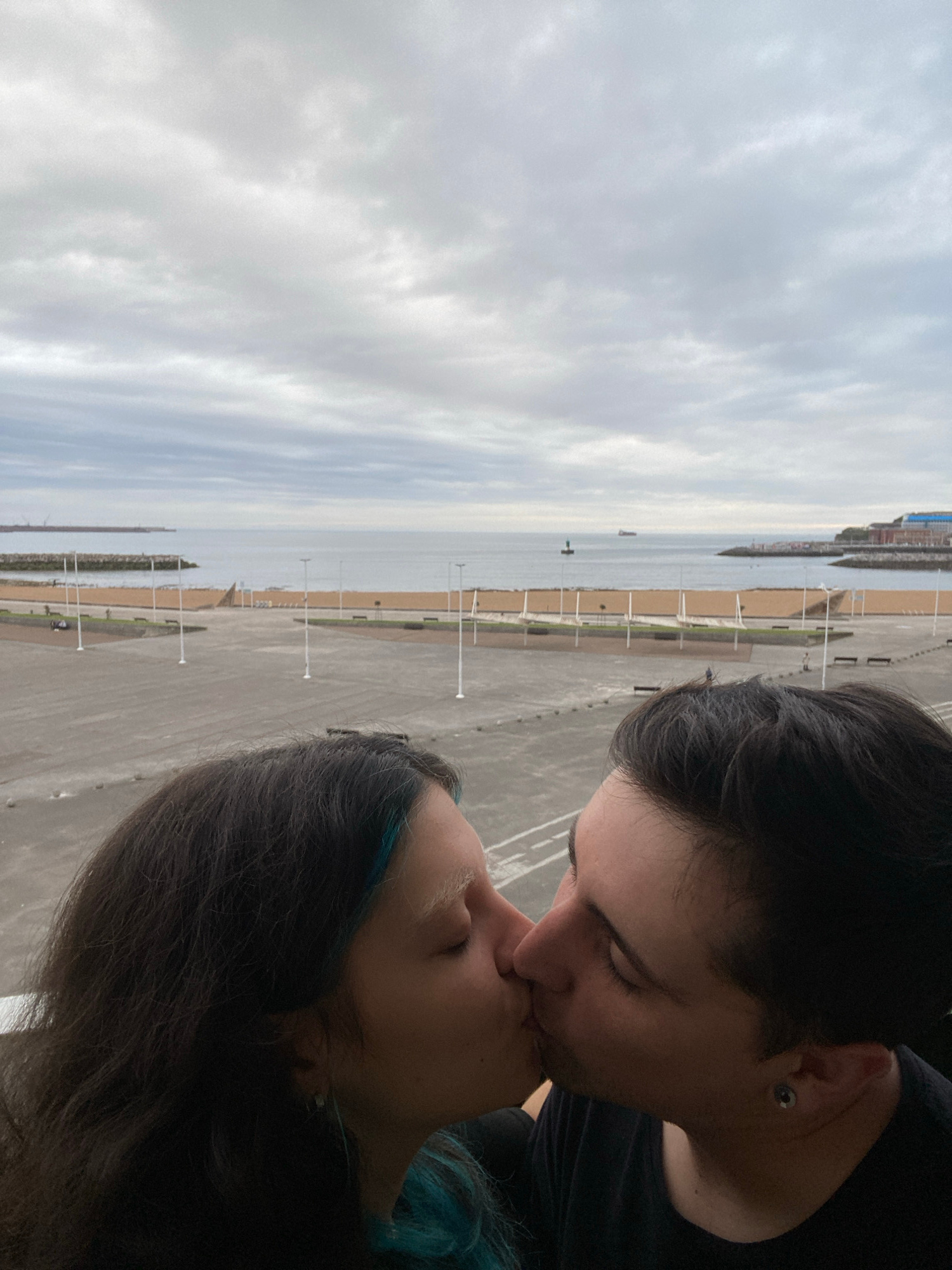 A photograph captures a couple in an embrace, their lips meeting in a kiss, set against the backdrop of Gijón/Xixón, Spain. The man, positioned on the upper right of the frame, has short, dark hair, w…read more