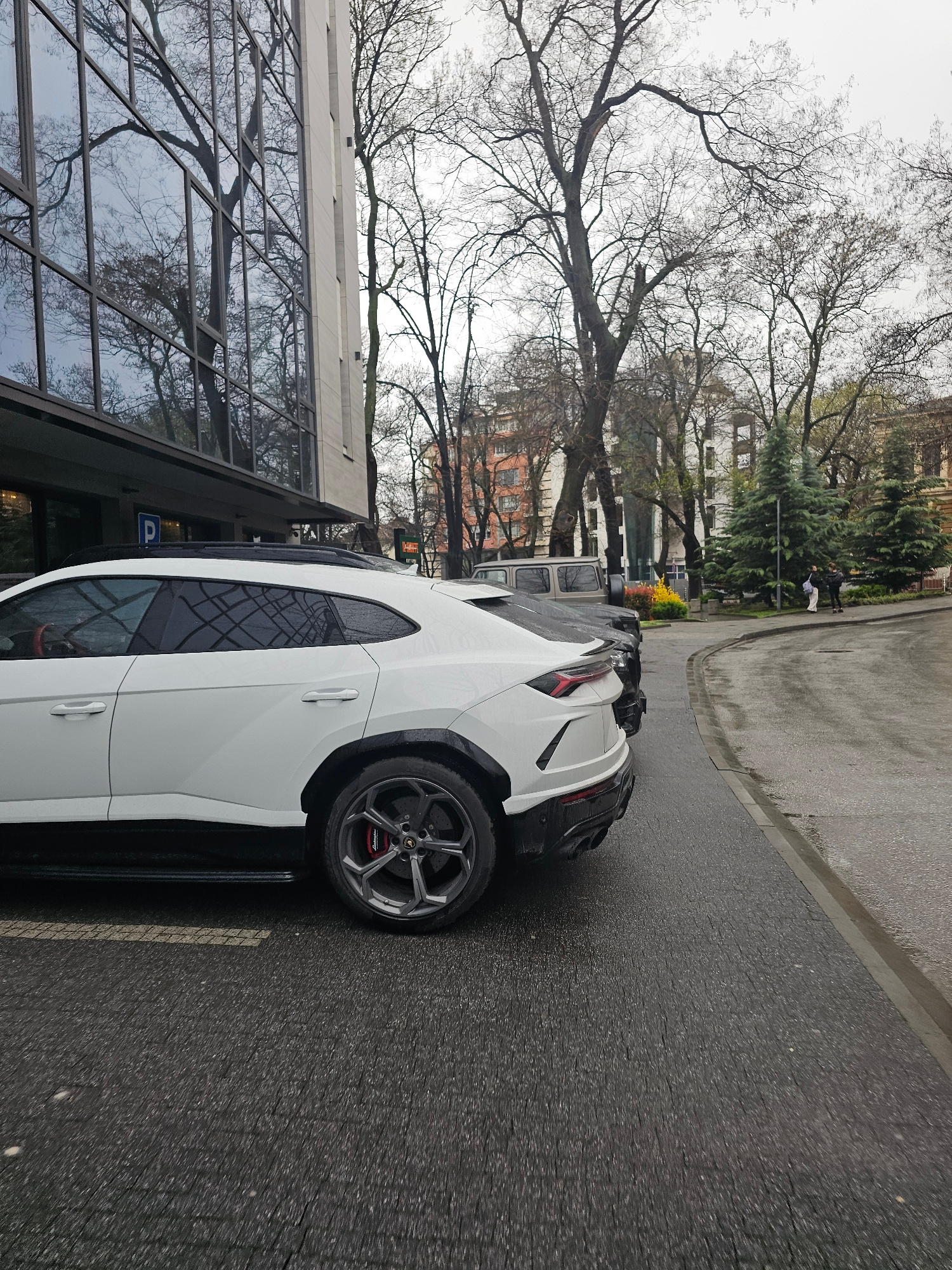 A white Lamborghini Urus is parked on a wet city street in Plovdiv, Bulgaria, adjacent to a modern building with reflective glass windows. A tree with bare branches is visible in the background, along…read more