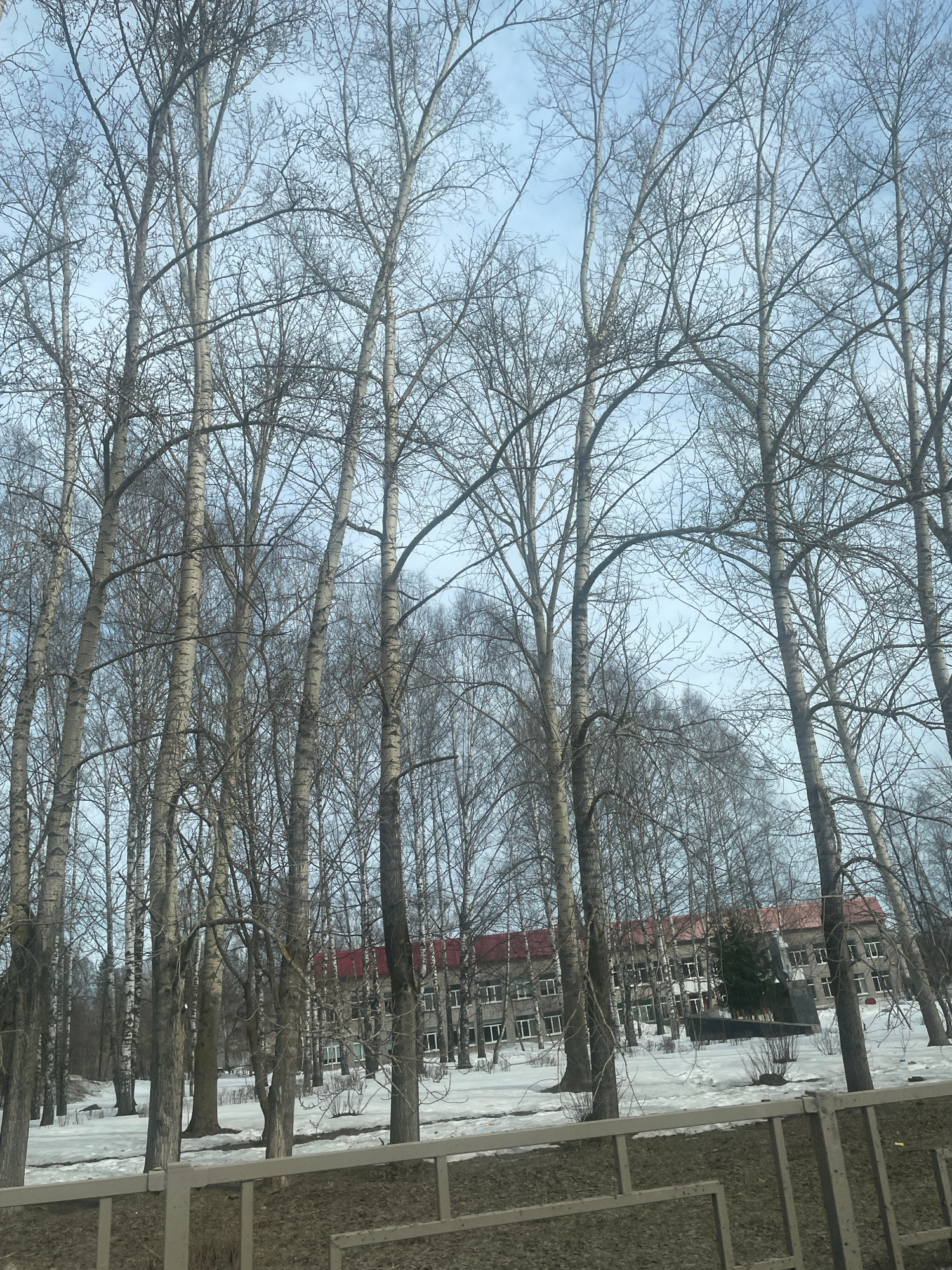 The image depicts a row of bare trees, likely birches, extending into the distance along a street. Behind the trees is a multi-story building, possibly an apartment complex, showing a brick or red-col…read more