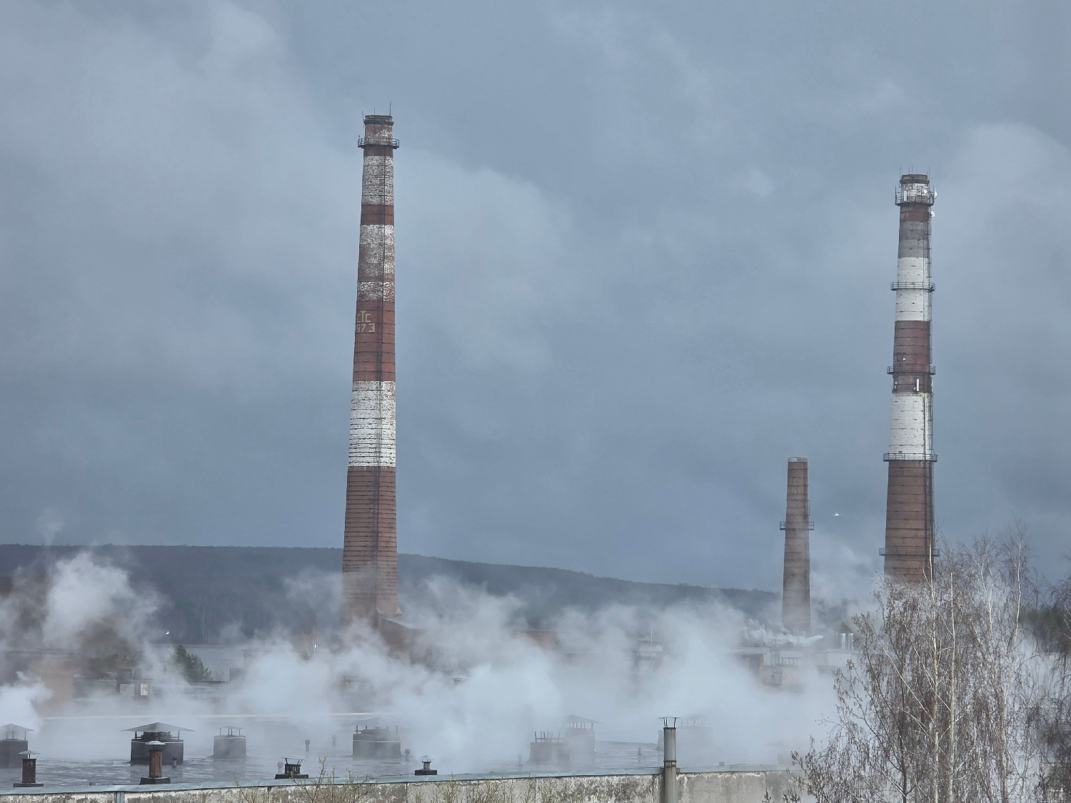 The image depicts an active industrial complex, likely a thermal power station, under a heavily overcast, grey sky. The scene is set in Chaikovsky, Russia. Dominating the mid-ground are two tall, red…read more