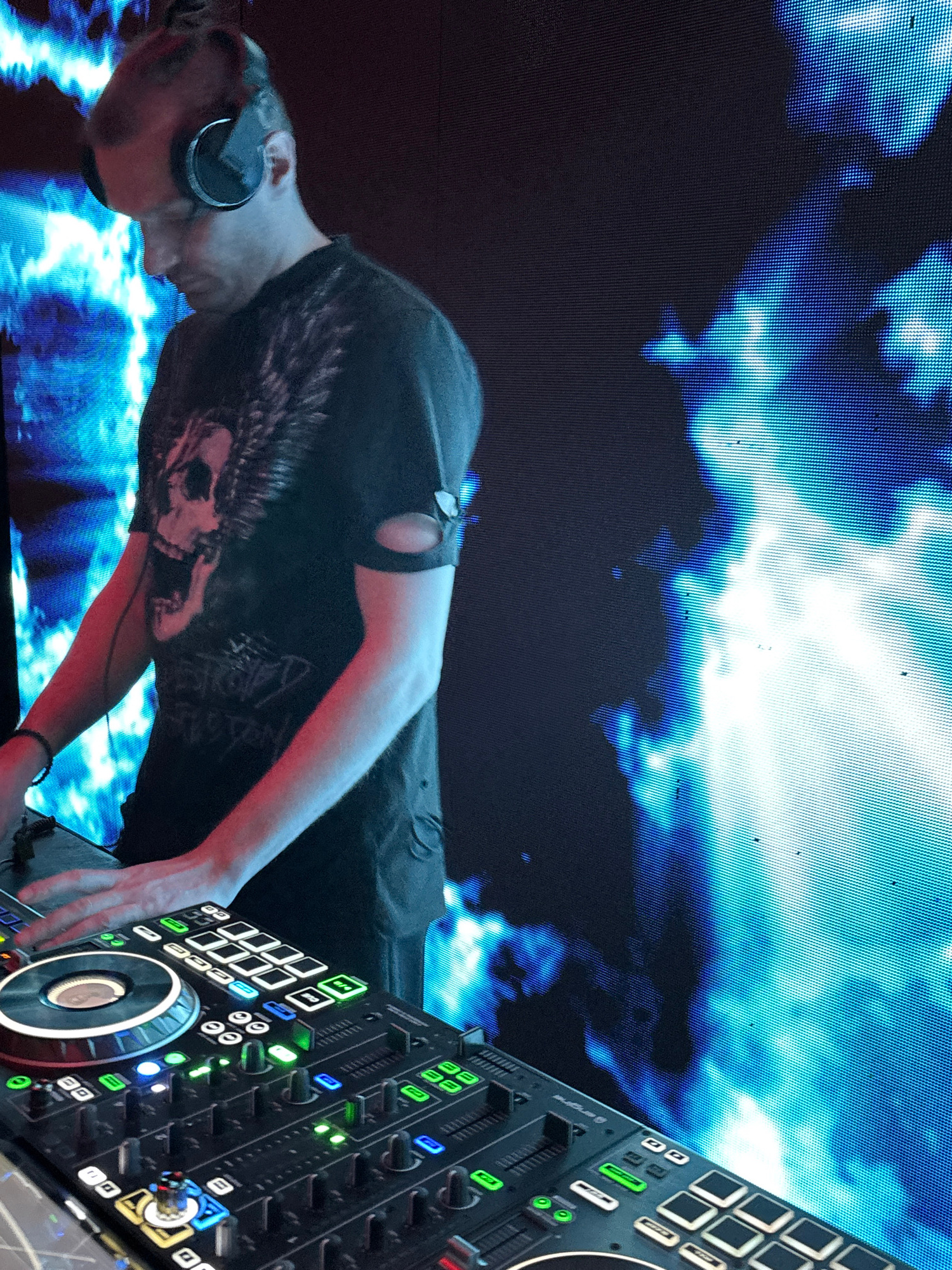 A person with headphones is operating a DJ controller in front of a large display screen. The person is wearing a dark t-shirt with a graphic on it. The screen shows a blue and white abstract design,…read more