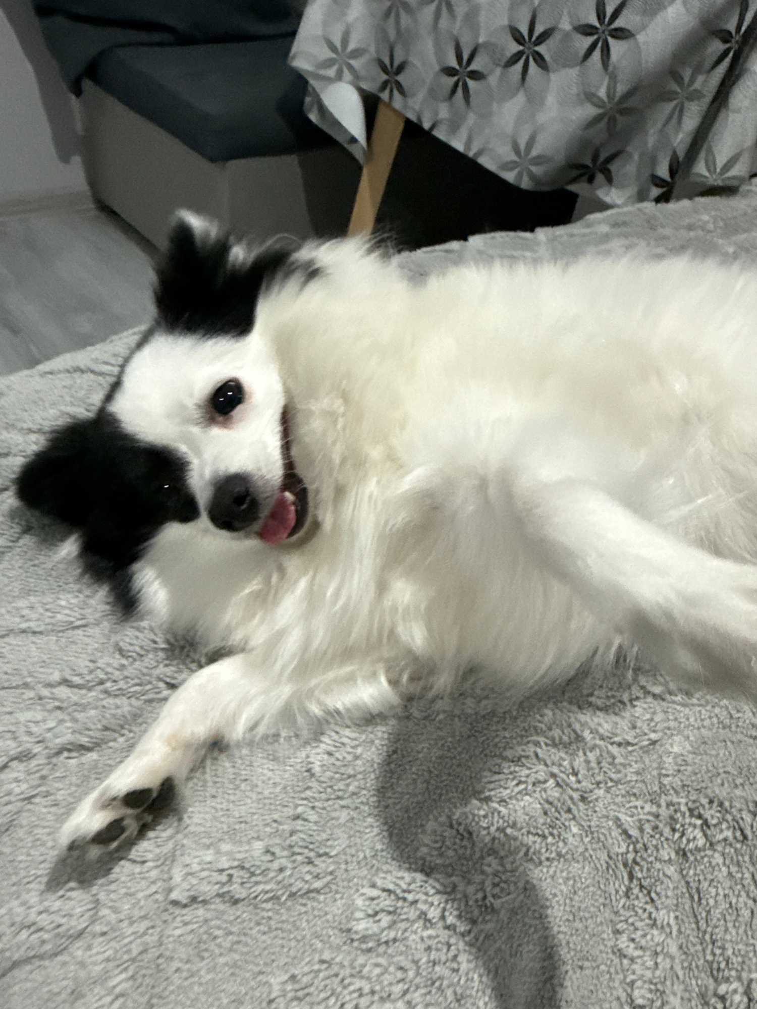A white and black dog lies on its back on a gray textured surface. The dog's head is visible, with its tongue slightly protruding. To the left of the dog are gray bedding and a gray pillow with a flor…read more