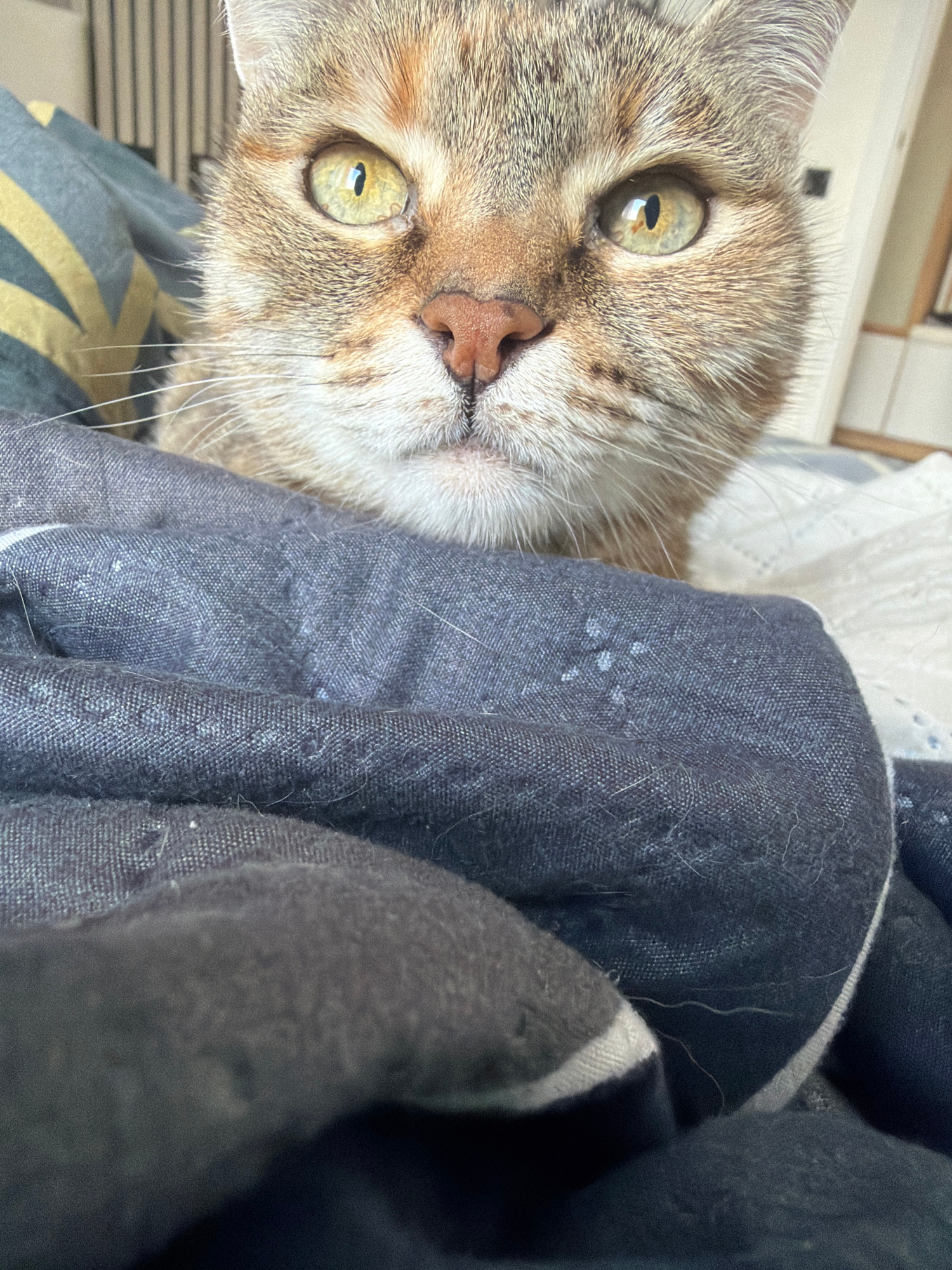A close-up, slightly tilted, portrait of a light brown and grey tabby cat with green eyes peeks out from a dark grey, possibly denim, fabric. A small, pink nose and long white whiskers are visible.…read more