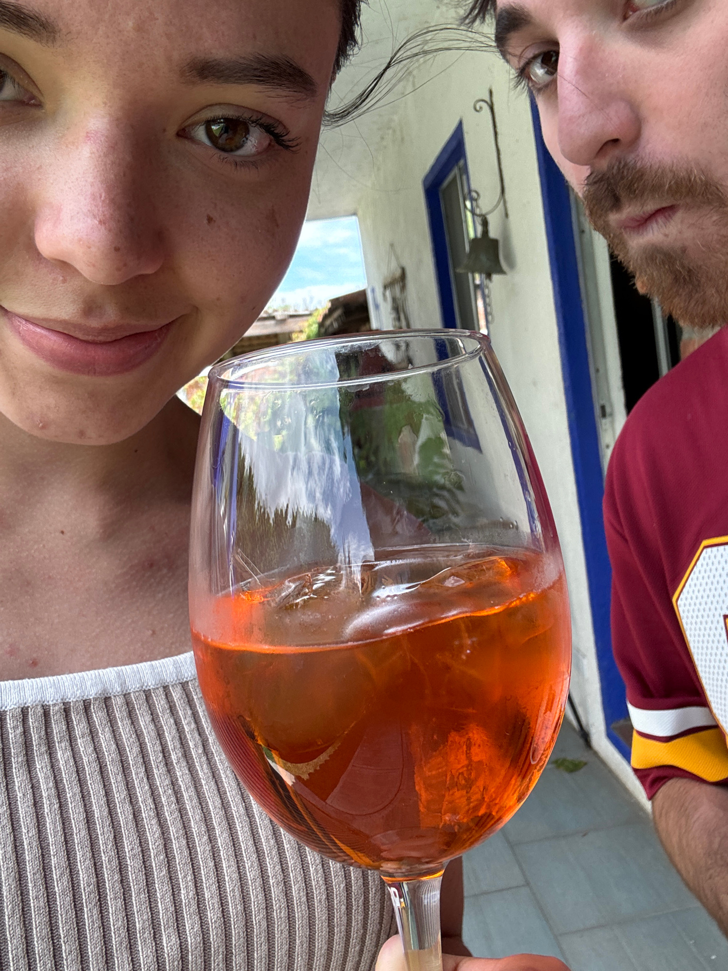 Two people are holding a glass of orange liquid. The person on the left has brown hair and eyes. The person on the right has a beard and is wearing a maroon shirt with gold and white accents. The glas…read more