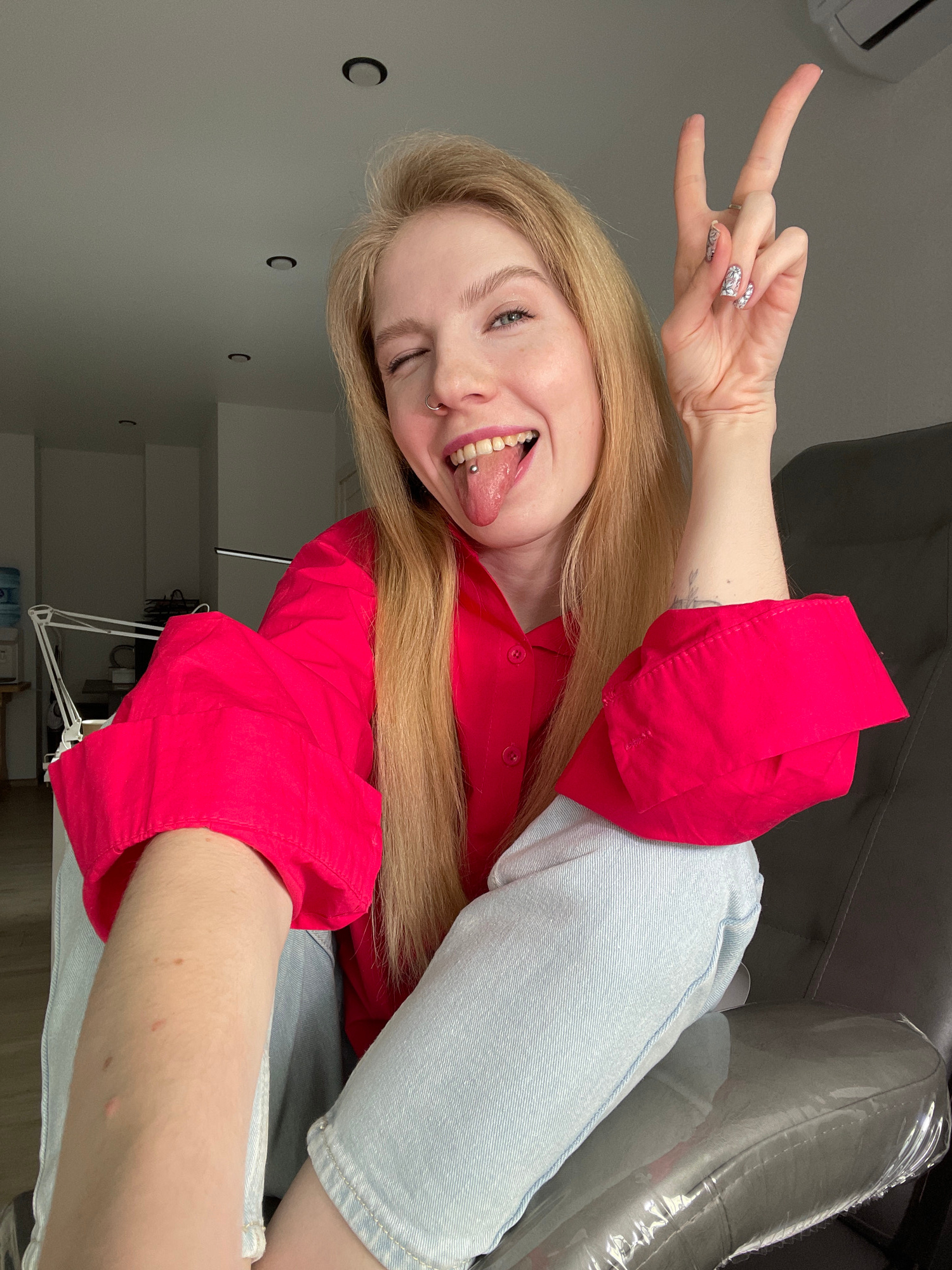 A young blonde woman is featured in a playful, vertically oriented selfie, captured from a slightly low angle. She is winking, sticking out her tongue (which has a barbell piercing), and making a "roc…read more