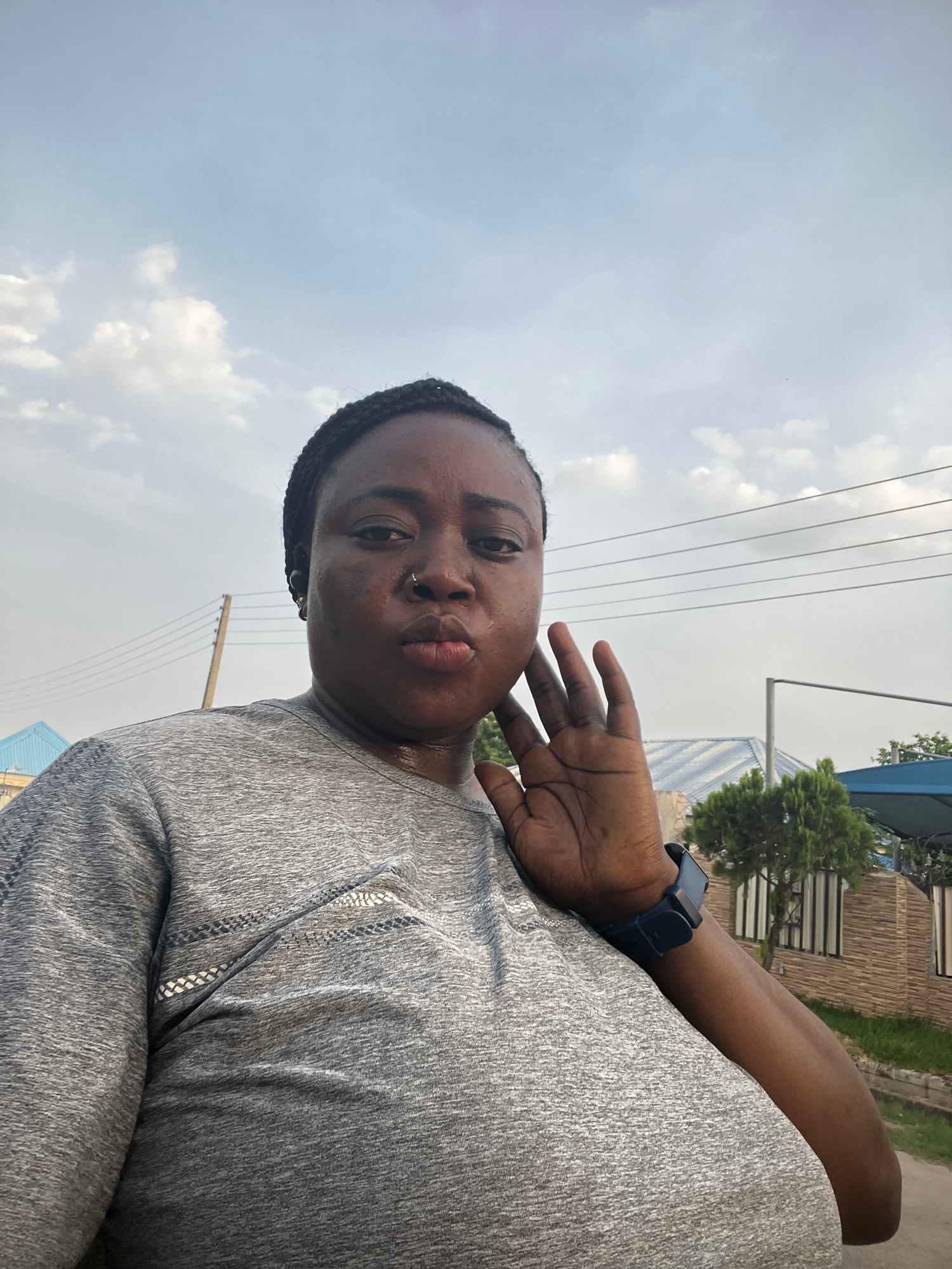 A medium shot, captured from a low angle, depicts a person with dark skin, styled hair, and a nose ring. They are wearing a grey patterned shirt and a dark blue smartwatch. The person's right hand is…read more