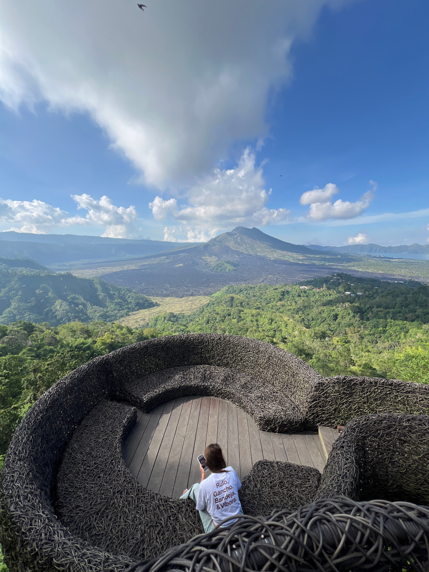 Here's a detailed description of the image: **Setting:** The image is taken from a viewpoint at Bali Pulina Agro Tourism, located in Kintamani, Indonesia. **Environment:** It's a bright, sunny day w…read more