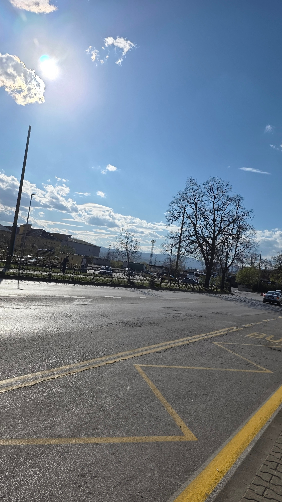 The image presents a street view on a sunny day in what appears to be an urban area. A road with yellow painted lines and markings occupies the right side of the frame, suggesting it is a bus stop zon…read more