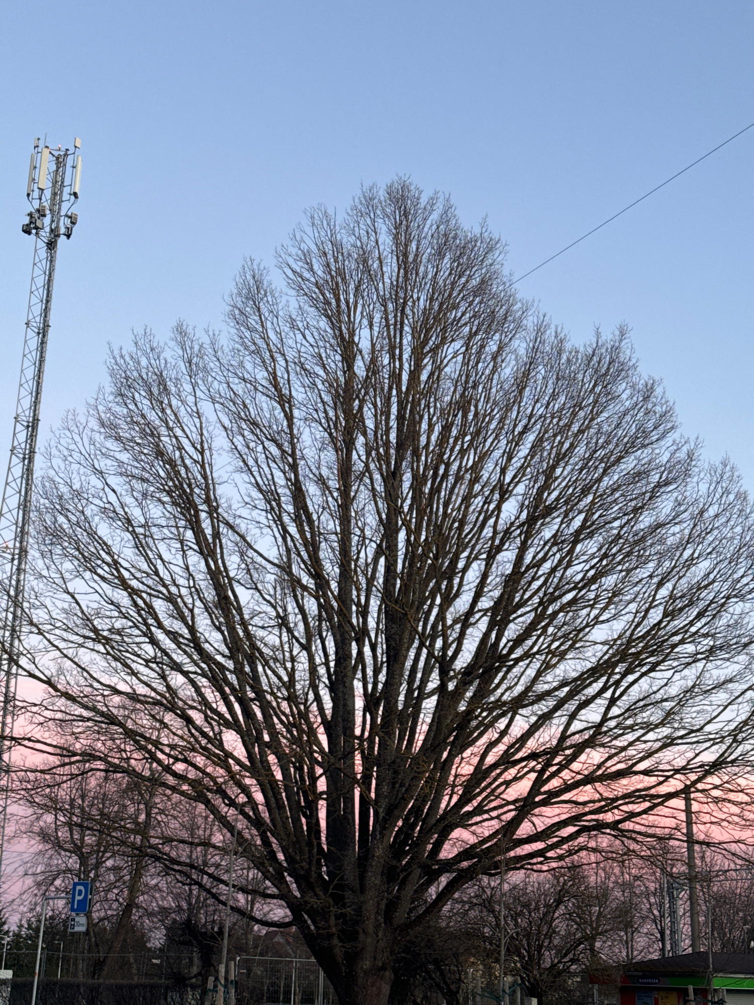 The image shows a bare tree with many branches against a light blue and pink sky, likely at sunset or sunrise. In the lower left corner of the image is a cell tower. The scene is set in Carnikava, Lat…read more