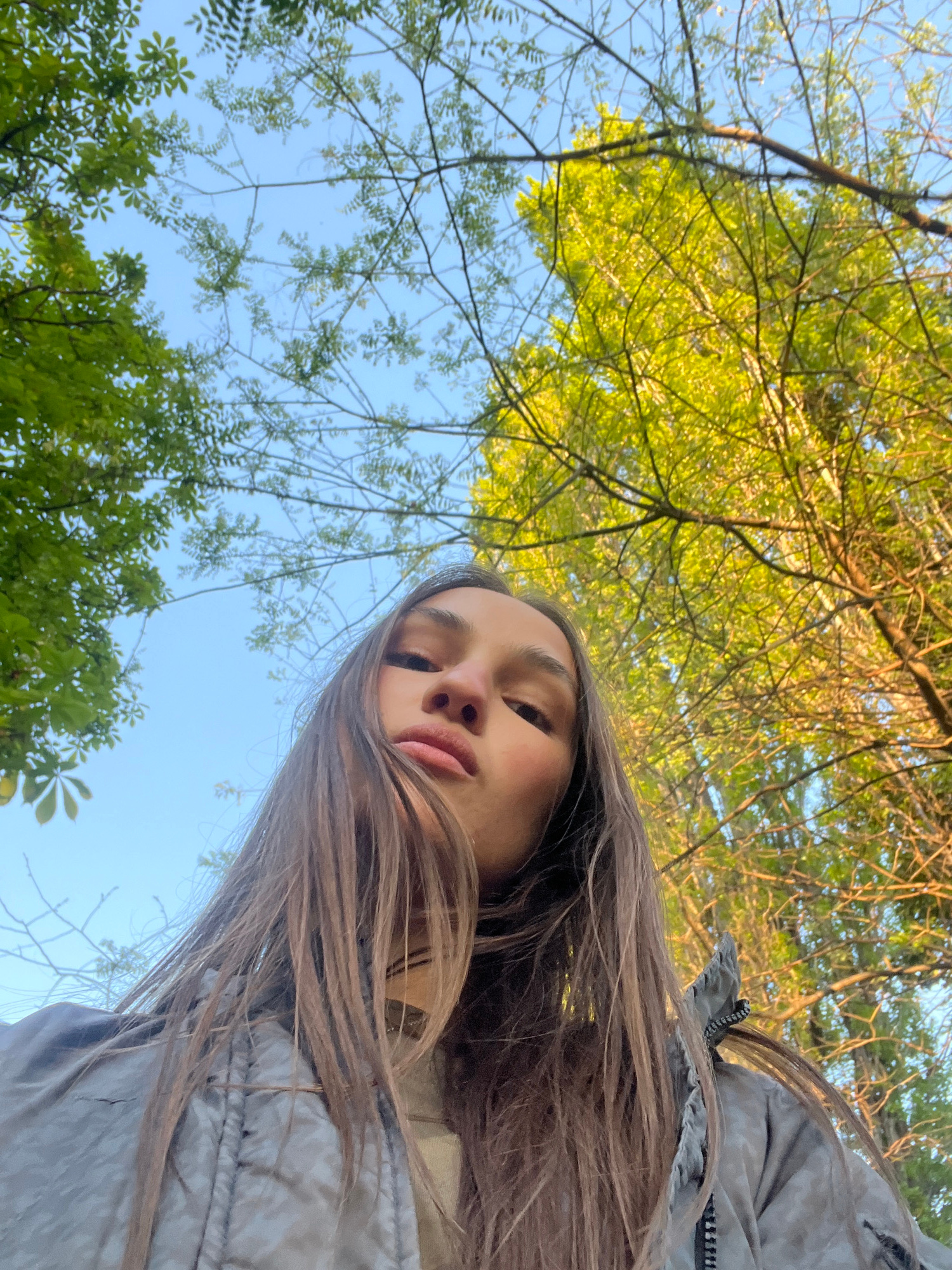 A woman is looking down into the camera from a low angle in Plovdiv, Bulgaria. Her long, brown hair is partially obscuring the view, and she is wearing a gray jacket. Above her, a sparse canopy of tre…read more