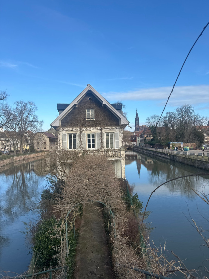 The image depicts a canal scene in the city of Strasbourg, France, likely within or near the Petite France district, characterized by a prominent house on a narrow land strip. The central subject is a…read more