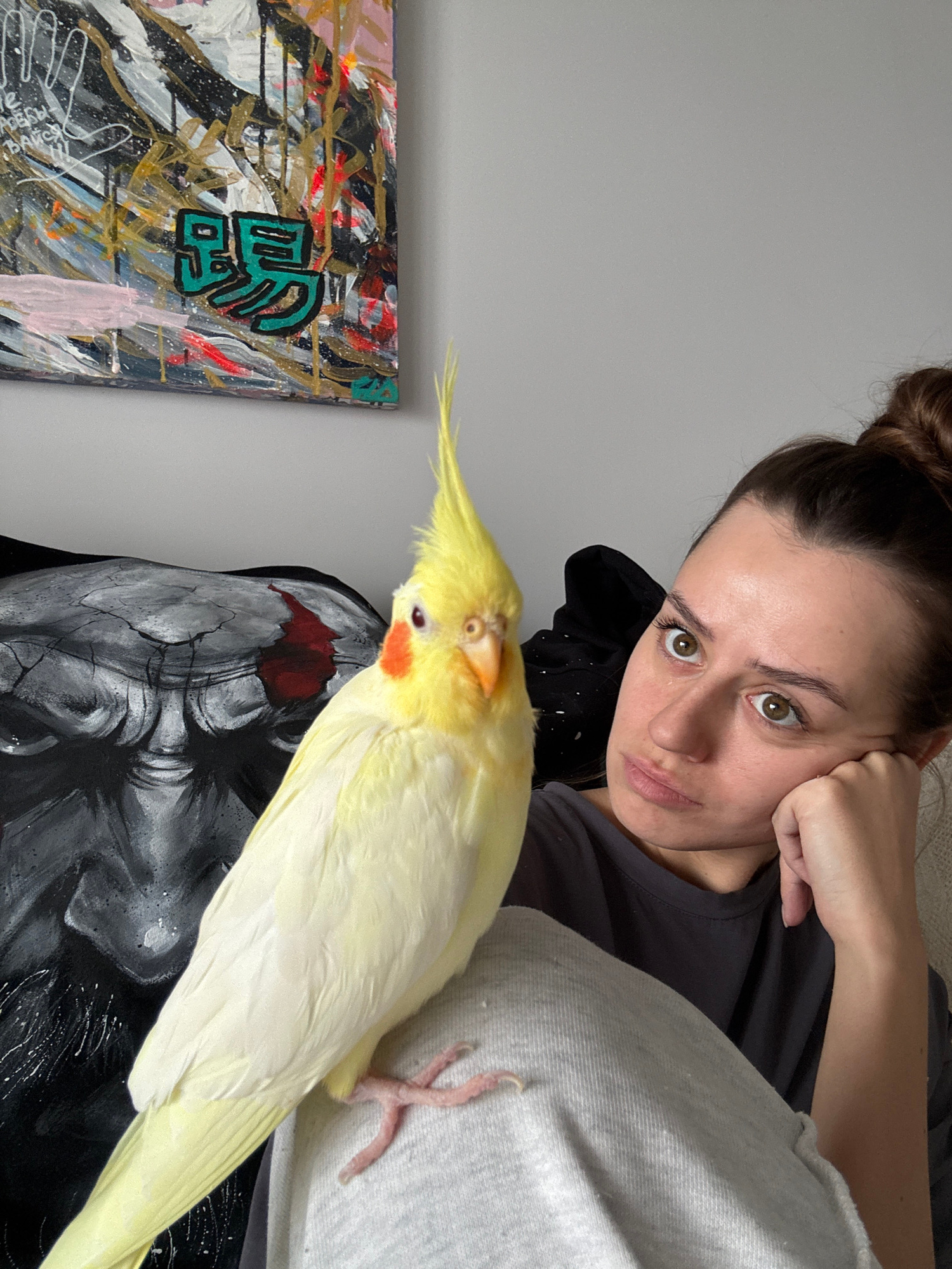 An indoor, diagonally oriented shot features a woman and her pet cockatiel in Krasnoyarsk, Russia. The woman, positioned in the top right, has fair skin, dark hair pulled back into a bun, and deep-set…read more
