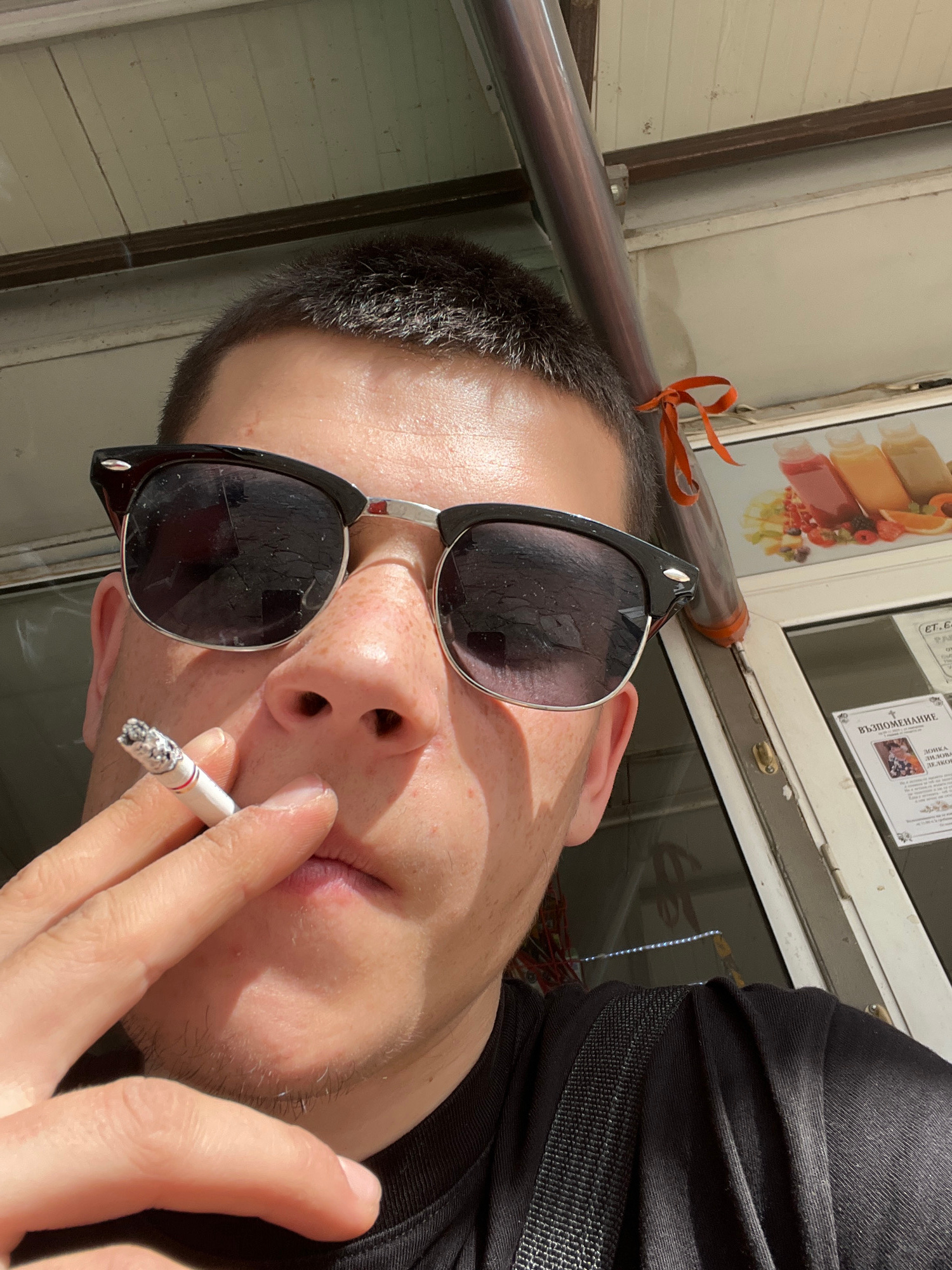 The image presents a close-up portrait of a person, severely tilted almost 90 degrees clockwise. The subject, appearing to be male, is in the foreground, wearing dark, possibly reflective, sunglasses…read more