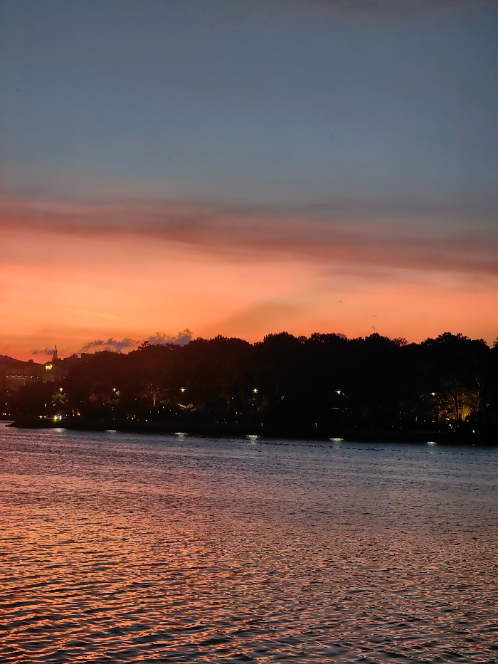 The image captures a twilight scene over Xuan Huong Lake in Da Lat, Vietnam. The sky dominates the upper half, exhibiting a gradient from deep blue-grey at the top to vibrant orange, red, and pink hue…read more