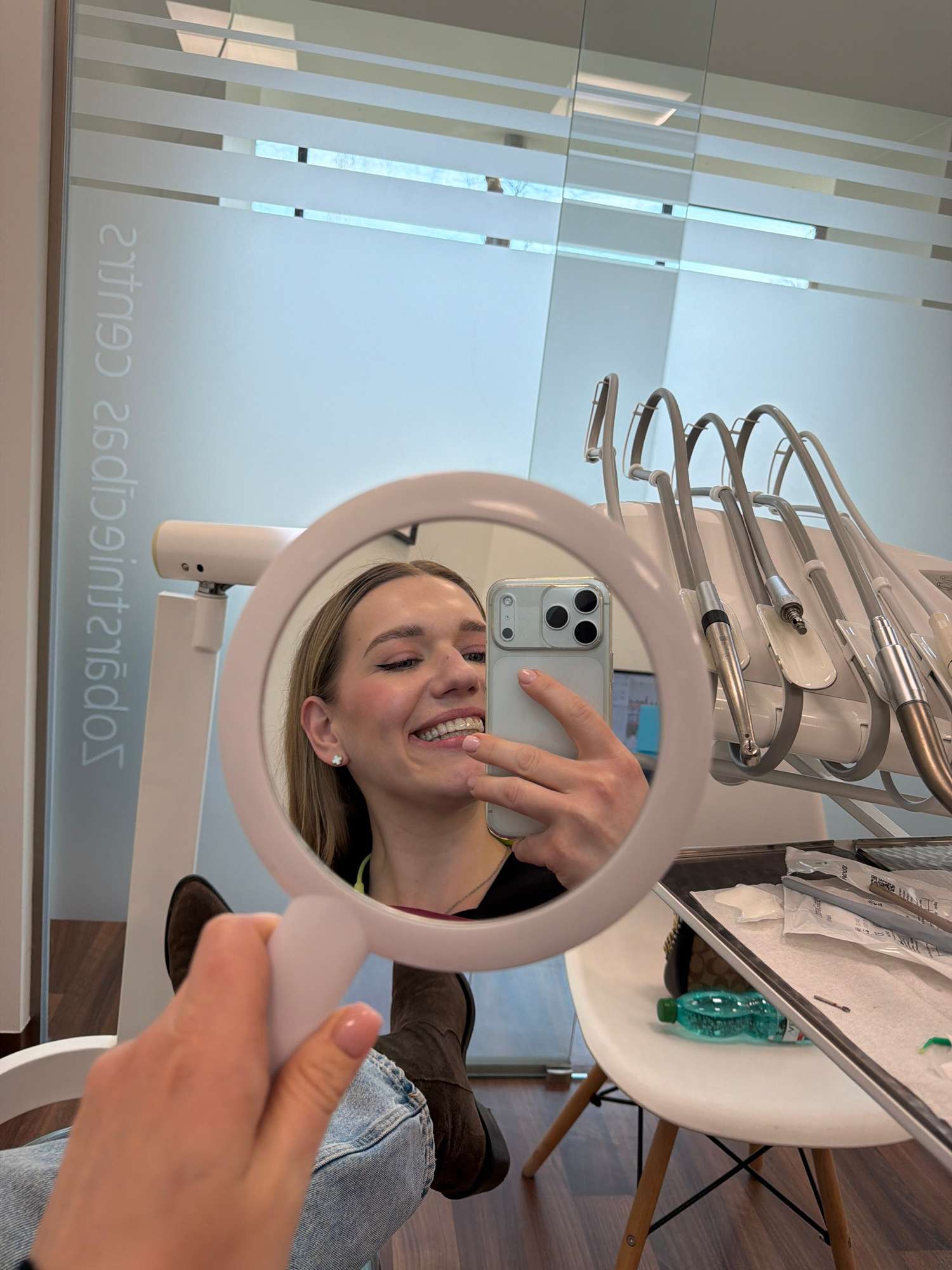 A mirror selfie captures a young woman smiling broadly in a modern dental office. The woman, with blonde hair and fair skin, is seen in the reflection, showcasing clear dental aligners on her teeth. S…read more