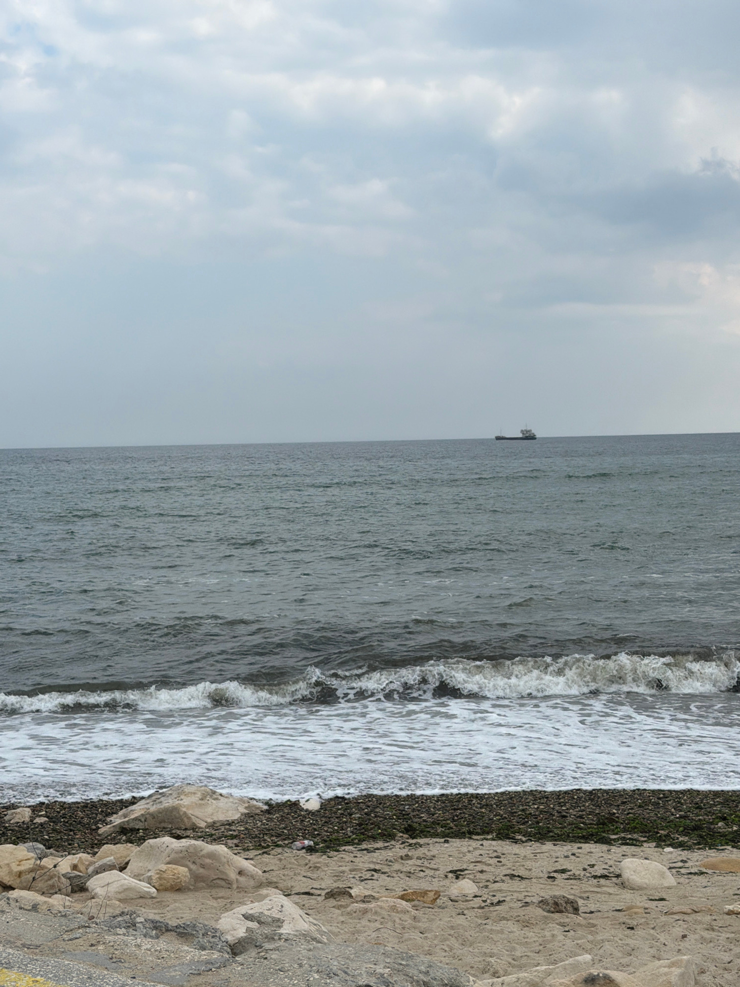 The image shows a view of the sea from the shore in Varna, Bulgaria. The sky is overcast with clouds. In the distance, a small structure, possibly an oil rig, is visible on the water. Waves are crashi…read more