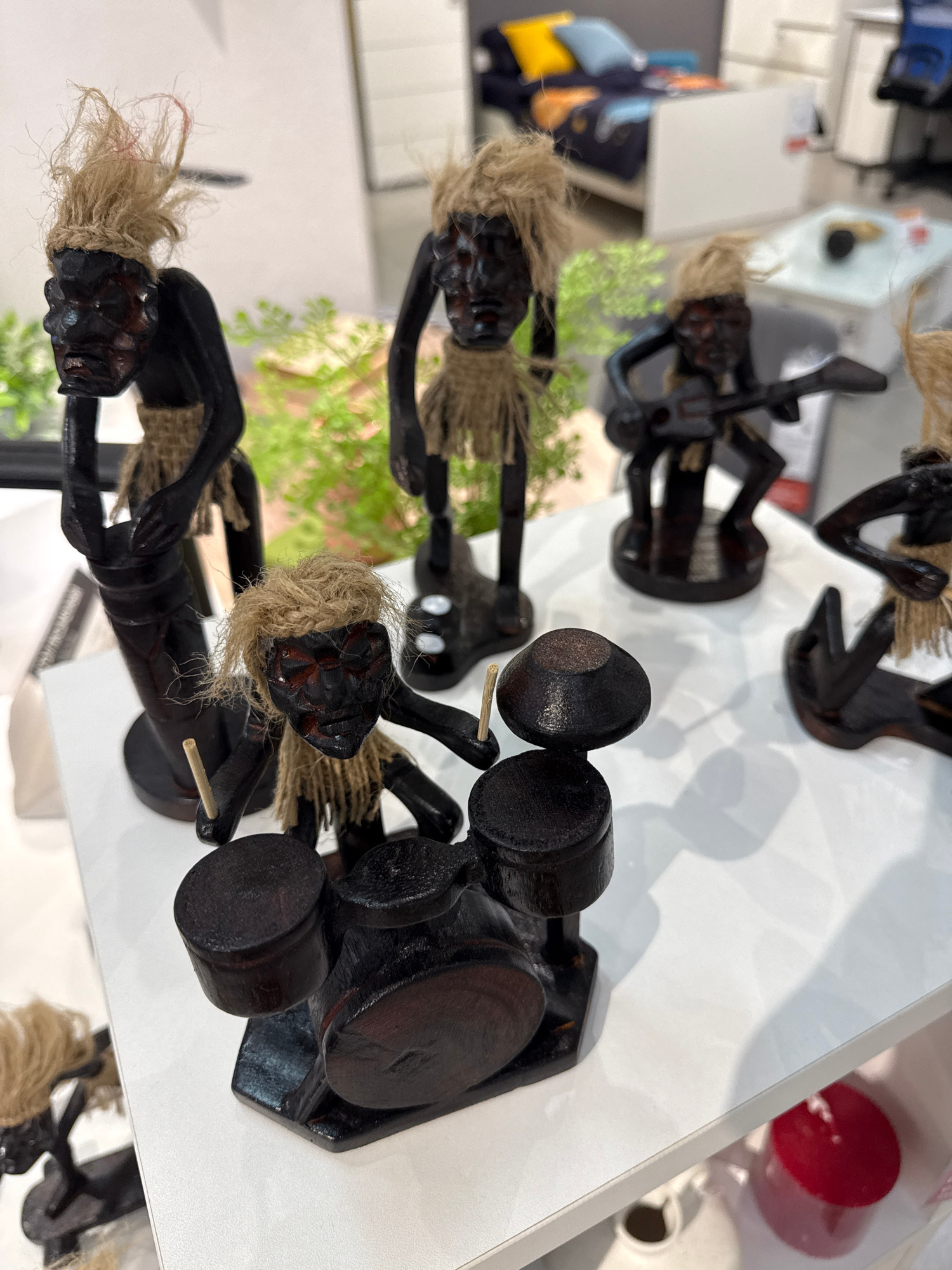 The image shows a collection of carved wooden figurines displayed on a white surface, possibly a shelf or counter. The figurines appear to represent musicians playing various instruments. One figurine…read more