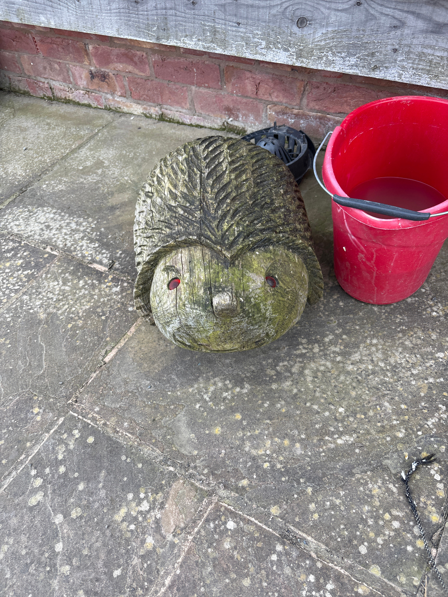 The scene shows an outdoor space in Shrewsbury, United Kingdom. A stone or concrete patio, patterned with square or rectangular tiles, forms the ground. The patio surface is weathered and shows signs…read more