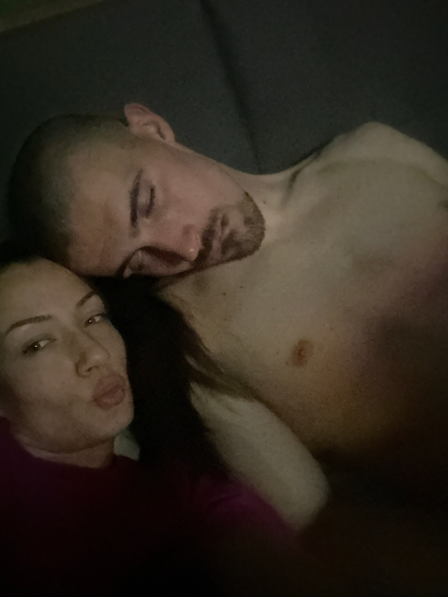 A low-angle, underexposed shot depicts two individuals. A shirtless man with a close-cropped haircut and a short beard lies on a dark surface. A woman with dark hair lies close to him, facing the came…read more