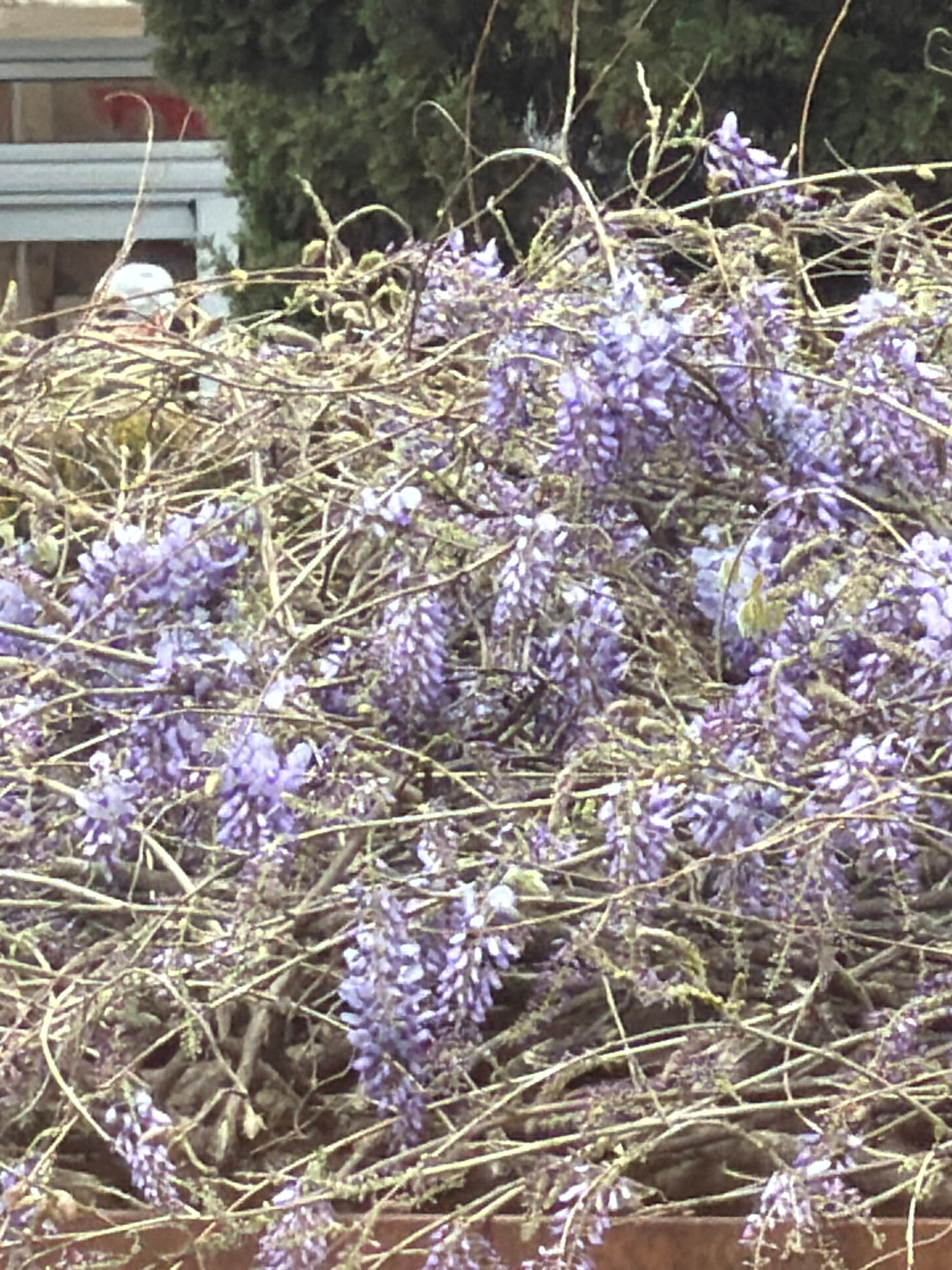 The image shows a close-up view of a wisteria plant with cascading purple flowers and twisting vines. The plant appears to be growing on a vertical surface, potentially a wall or a tree trunk. The bac…read more