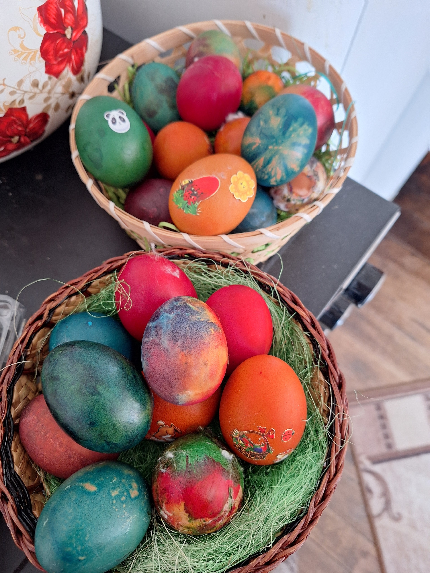 Two baskets filled with colorful Easter eggs are placed indoors. The basket on the left is made of a light-colored material, while the one on the right is made of darker brown material. The basket on…read more