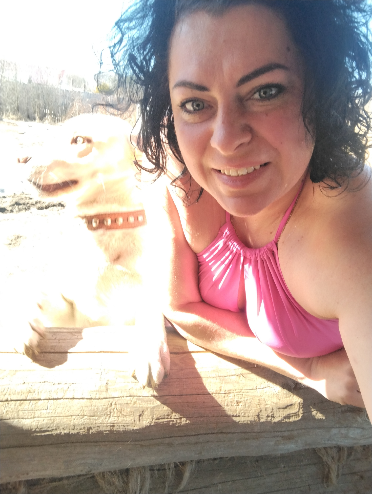 A selfie of a woman with curly dark hair, fair skin, and wearing a pink swimsuit. She is smiling and lying on a wooden surface. Beside her is a pale yellow dog wearing a studded collar. The background…read more