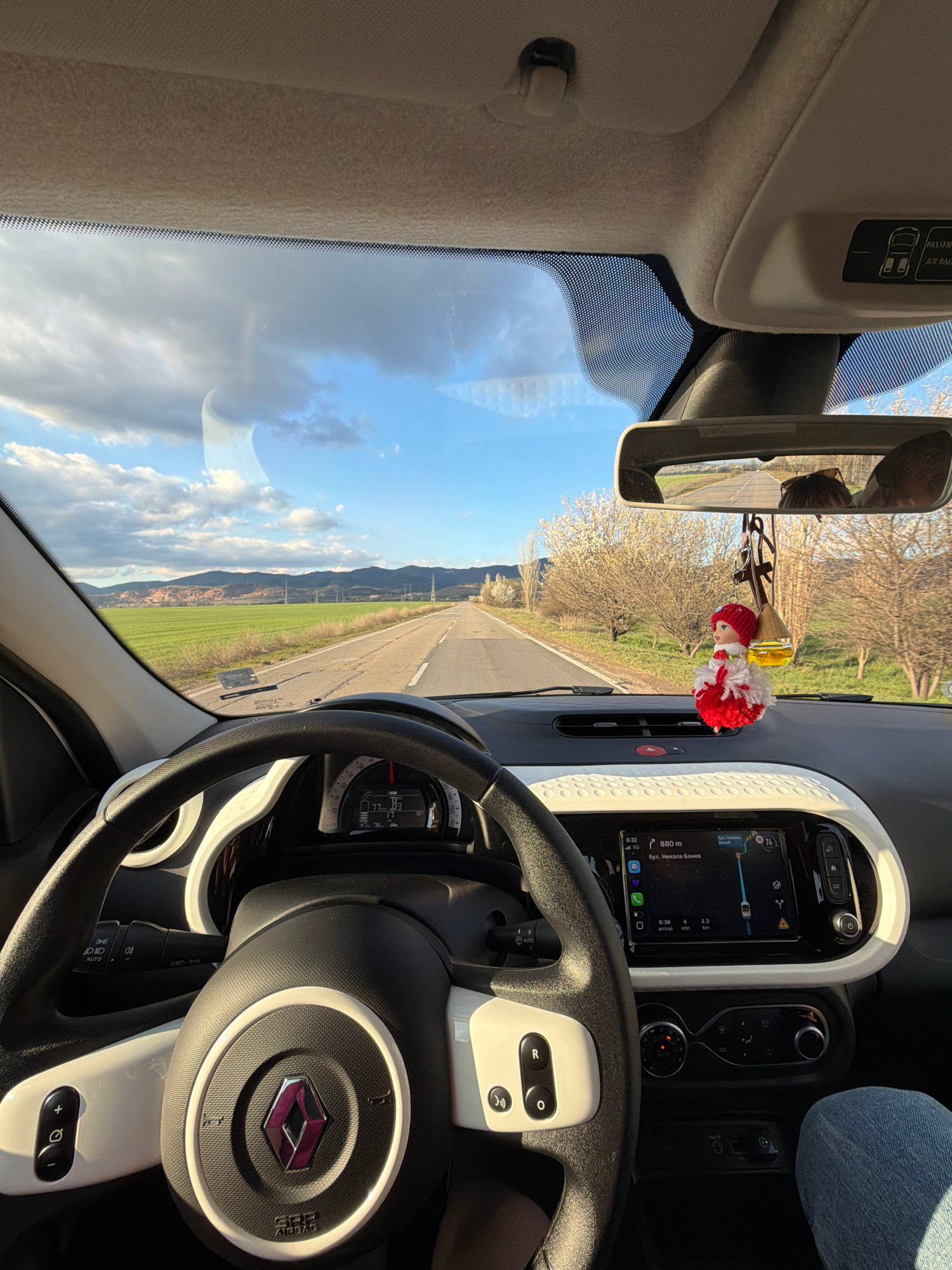 The image, taken from inside a car, shows the dashboard and steering wheel of a Renault Twingo. A road stretches into the distance as seen through the windshield and rearview mirror. The navigation sy…read more