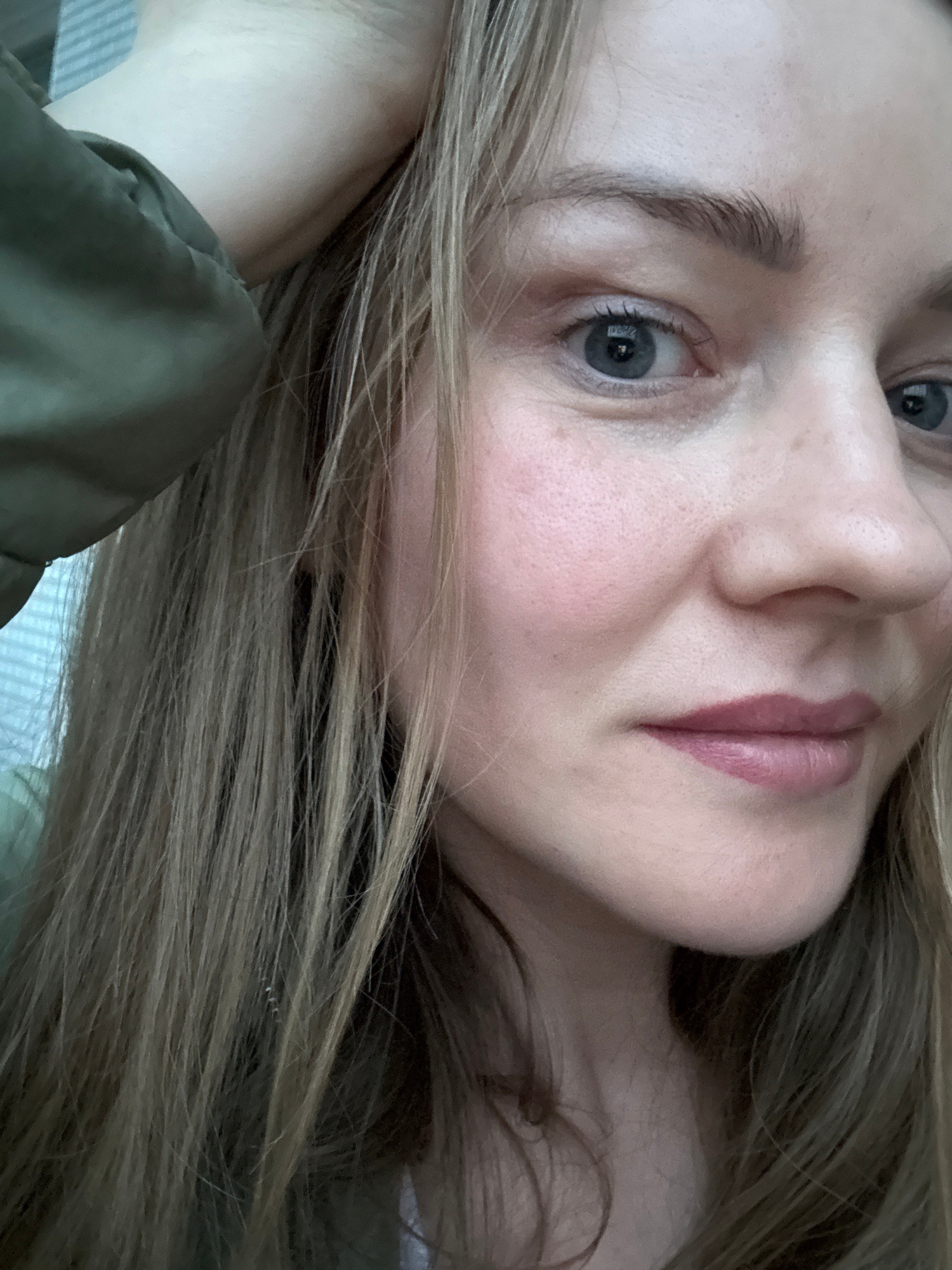 A close-up, slightly rotated image focuses on a woman's face. Her eyes are light-colored, and her hair, a light brown shade, is long and partially obscures her face. She has fair skin with visible por…read more