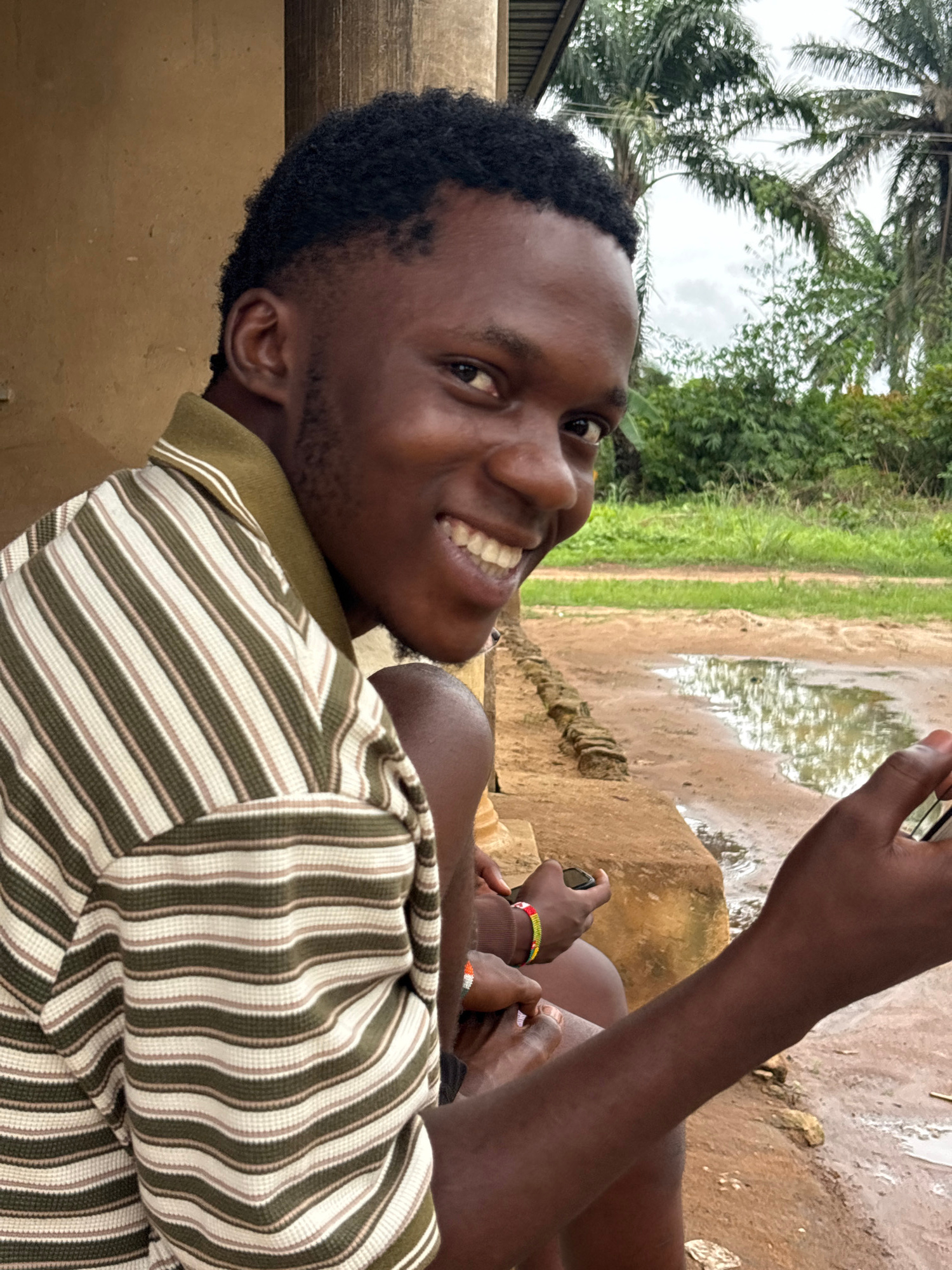 A young, dark-skinned man with short hair and a stubbly beard smiles at the camera. He is wearing a striped shirt and appears to be sitting. In the background is a muddy, rural environment with trees…read more