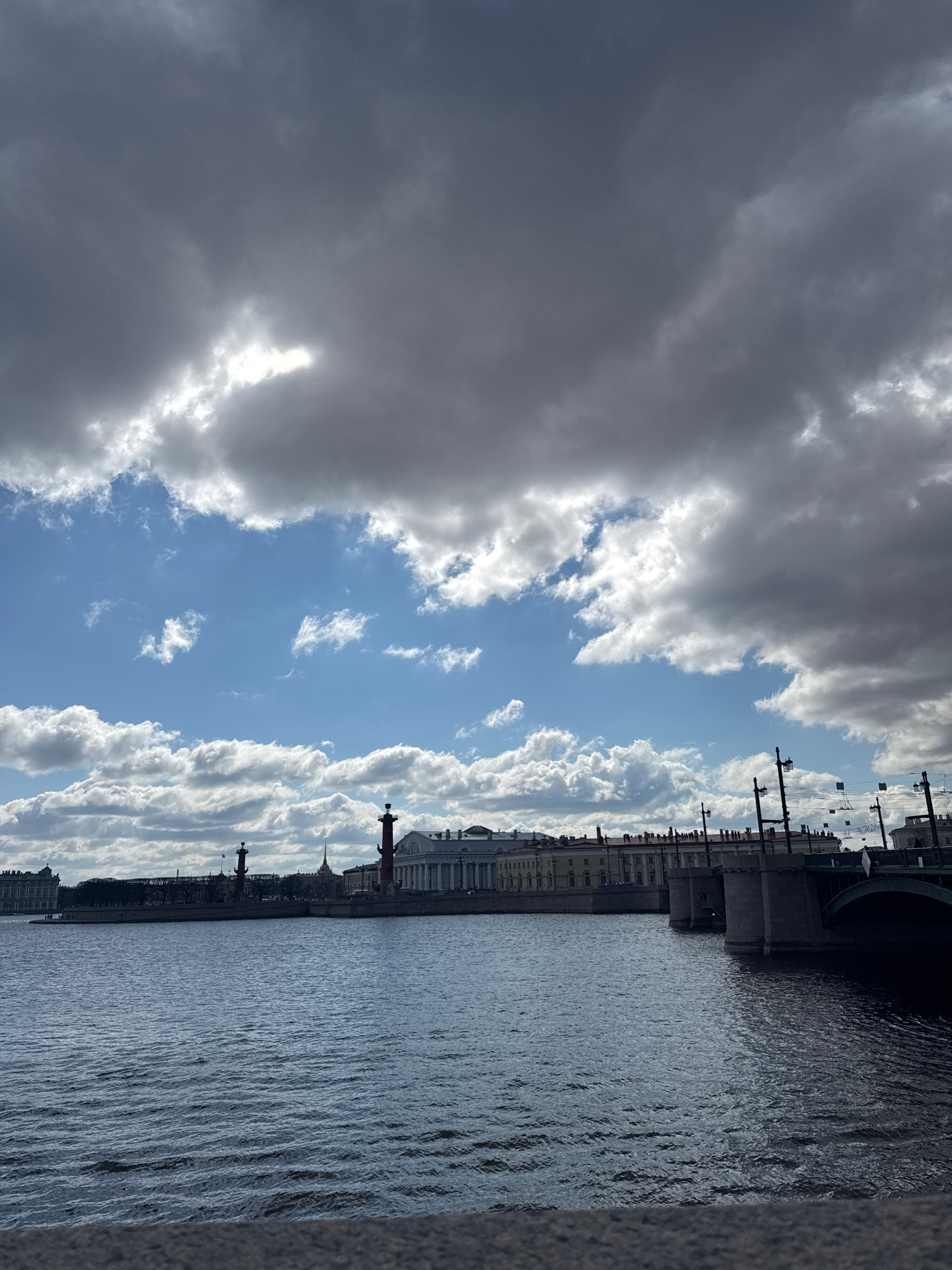 The image shows a section of the Neva River in Saint Petersburg, Russia, under a cloudy sky. The right side of the frame includes a portion of a granite embankment, and the Neva River fills the center…read more