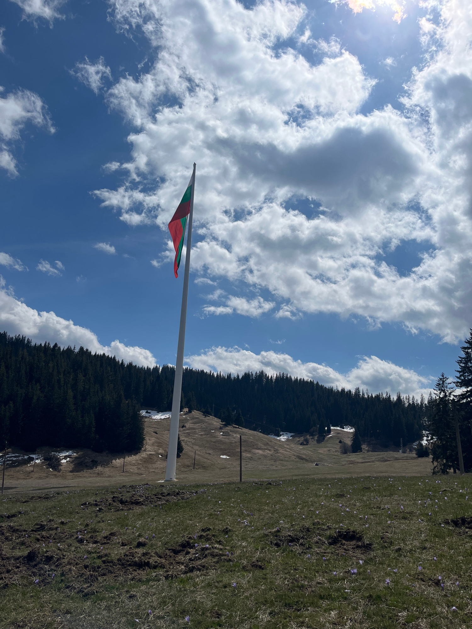 A photograph shows a landscape scene in Smolyan, Bulgaria, with a Bulgarian flag prominently displayed. The flag, with its green, white, and red stripes, is mounted on a white flagpole that extends inβ¦read more